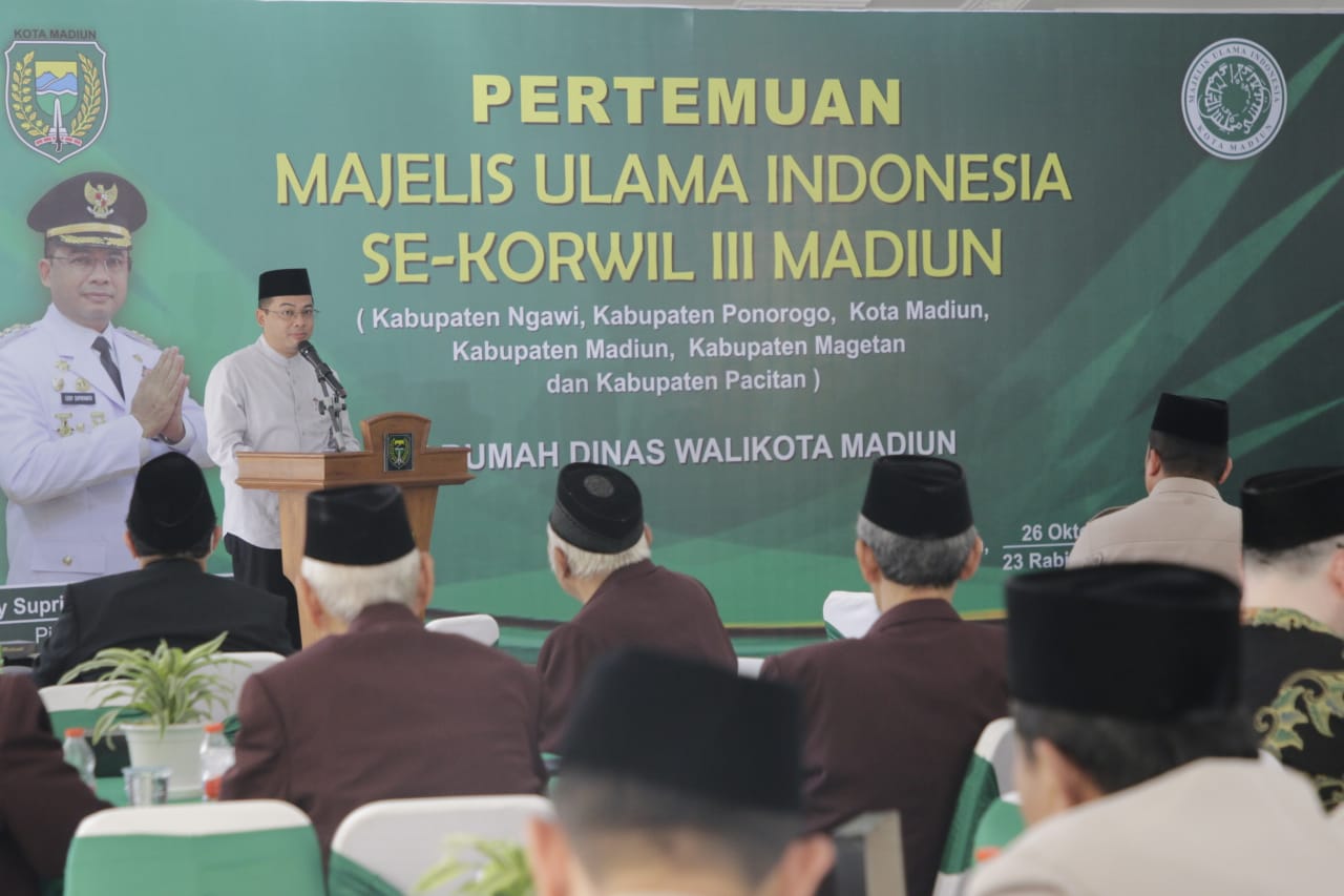MADIUN - MUI Korwil III Madiun menggelar rapat koordinasi pada Sabtu (26/10). Kegiatan tersebut berlangsung di rumah dinas wali kota. Pj Wali Kota Madiun Eddy Supriyanto pun hadir memenuhi undangan untuk memberikan sambutan.