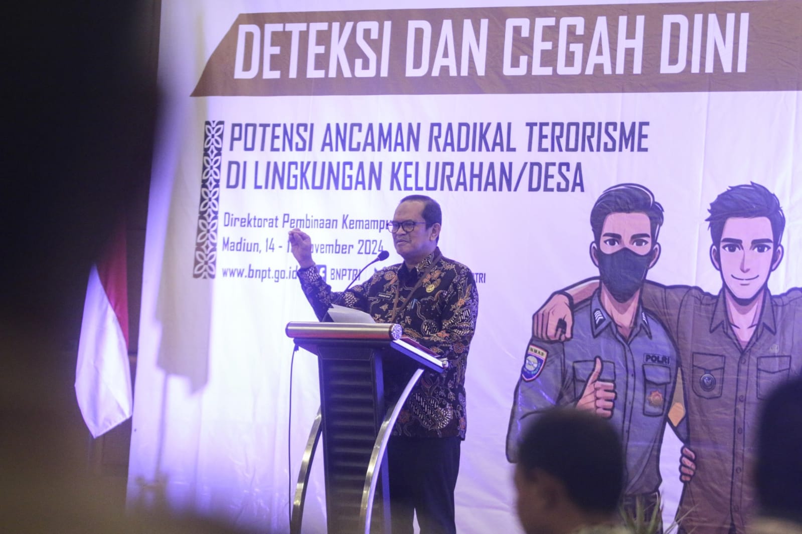 MADIUN - Sebagai upaya meningkatkan kewaspadaan masyarakat terhadap potensi ancaman terorisme, Pemerintah Kota Madiun menggandeng Badan Nasional Penanggulangan Terorisme (BNPT) menggelar sosialisasi buku saku pedoman deteksi dini potensi radikalisme di Kelurahan/Desa.