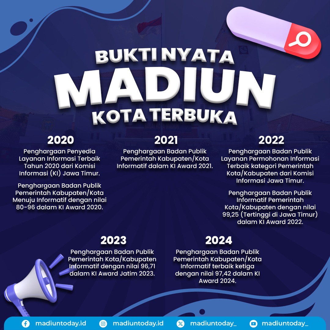 Sementara pada 2022, Kota Madiun sedang dalam performa terbaik urusan keterbukaan informasi. Kota Madiun kembali mendapat dua penghargaan dalam KI Award di tahun itu. Yakni, Penghargaan Badan Publik Layanan Permohonan Informasi Terbaik kategori Pemerintah Kota/Kabupaten dan Penghargaan Badan Publik Informatif Pemerintah Kota/Kabupaten. Menariknya, Kota Madiun mendapatkan nilai 99,25 untuk penghargaan Badan Publik Informatif. Itu merupakan nilai tertinggi di Jawa Timur dalam KI Award 2022.