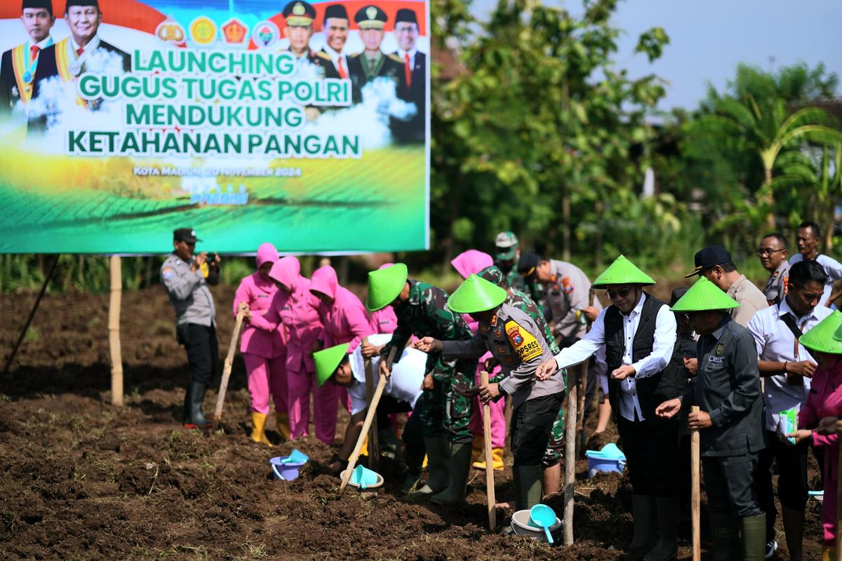 MADIUN - Pj Wali Kota Eddy Supriyanto bersama dengan TNI dan Polri melakukan penanaman benih jagung secara bersama-sama pada Rabu (20/11).