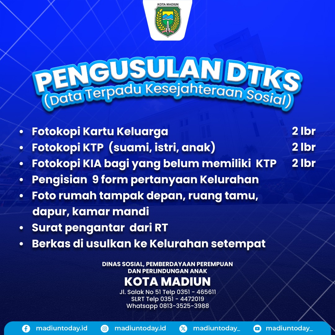 Kepala Dinas Sosial Pemberdayaan Perempuan dan Perlindungan Anak (Dinsos PPPA) Kota Madiun melalui Kabid Sosial, Rita Susanti menyebut masyarakat miskin bisa mengusulkan agar masuk DTKS tersebut. Syaratnya juga cukup mudah. Yakni, fotokopi KK dan fotokopi KTP suami, istri, anak (KIA bagi yang belum ber-KTP). Selain itu juga menyertakan foto rumah tampak depan, ruang tamu, dapur, dan kamar mandi. Pengusul juga memerlukan surat pengatar dari RT.