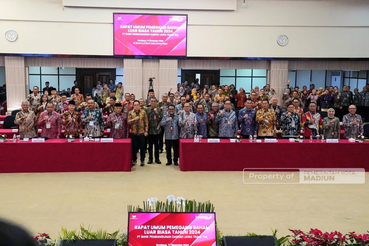 Surabaya – PT Bank Pembangunan Daerah Jawa Timur Tbk menggelar Rapat Umum Pemegang Saham Luar Biasa (RUPSLB) Tahun 2024 pada Rabu (11/12) di Ruang Bromo Kantor Pusat Bank Jatim, Surabaya. Acara ini dihadiri oleh para pemegang saham, termasuk Pj. Wali Kota Madiun Eddy Supriyanto.