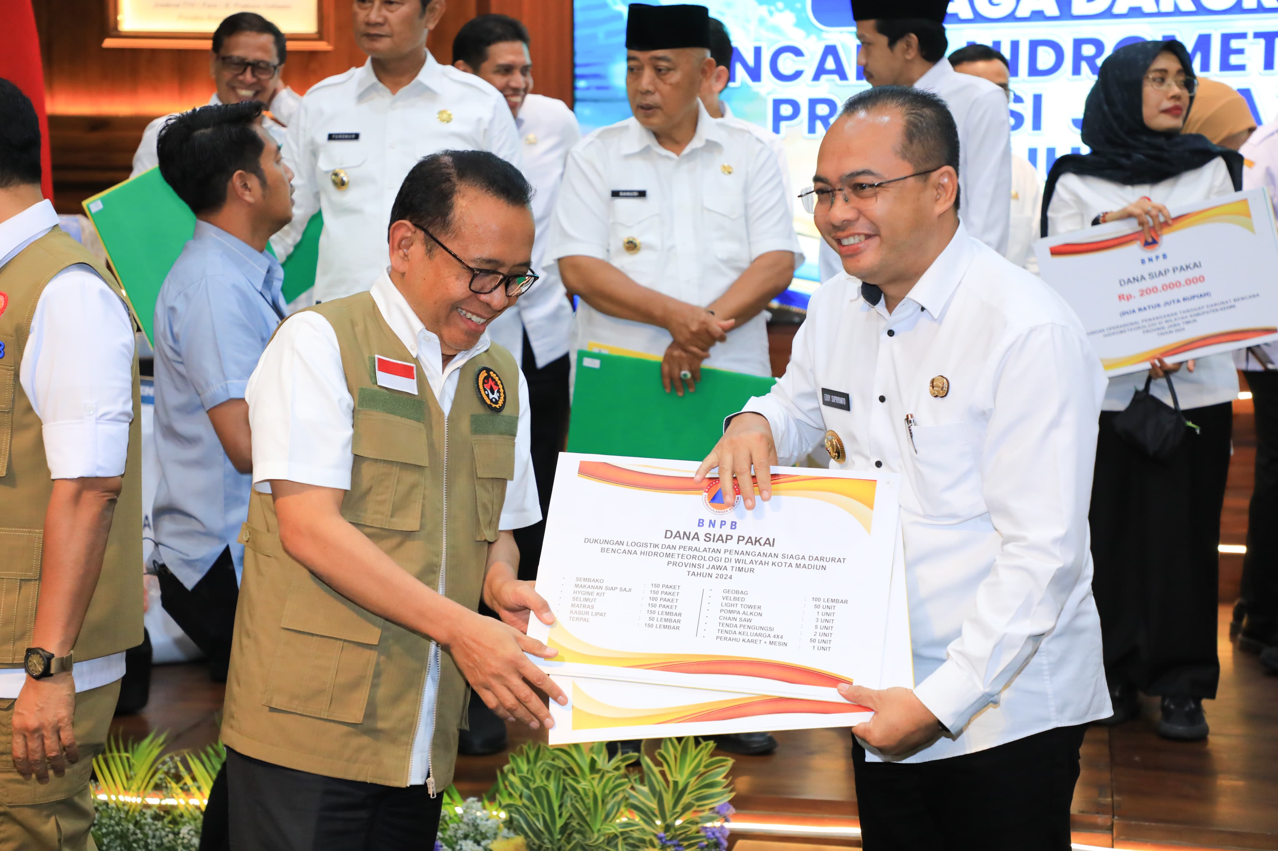 Seremonial bantuan tersebut diterima Pj Wali Kota Madiun, Eddy Supriyanto yang hadir memenuhi undangan rakor. Bantuan yang diterima di antaranya, Sembako dan makanan siap saji masing-masing sebanyak 150 paket, hygine kit, selimut, dan matras masing-masing sebanyak 150 buah, kasur lipat sebanyak 50 lembar, terpal sebanyak 150 lembar, tenda pengungsi sebanyak dua unit, tenda keluarga 4x4 sebanyak 50 unit, pompa alkon sebanyak 3 unit, perahu karet dan mesin sebanyak satu unit, dan lain sebagainya.