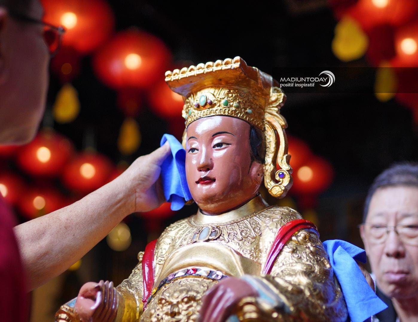 MADIUN - Perayaan Tahun Baru Imlek akan segera tiba. Menyambut momen tersebut, warga keturunan Tionghoa di Kota Madiun berkumpul di Klenteng TITD Hwie Ing Kiong untuk melaksanakan tradisi Kimsin. Yakni, ritual memandikan rupang dewa, Minggu (26/1).