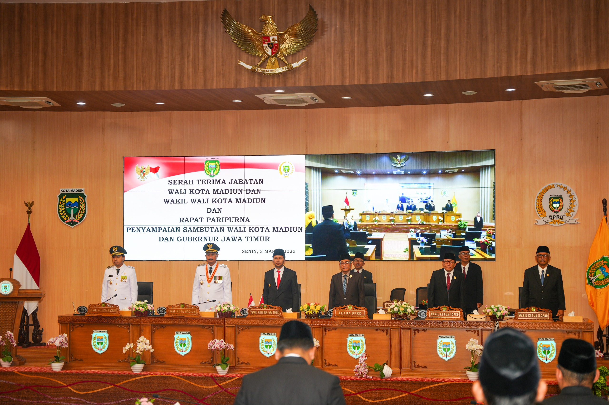 MADIUN - Serah terima jabatan (Sertijab) dari Penjabat (Pj) Wali Kota Madiun, Eddy Supriyanto, kepada Wali Kota Madiun terpilih, Dr. Maidi, dan Wakil Wali Kota Madiun, F. Bagus Panuntun, berlangsung khidmat dalam rapat paripurna DPRD Kota Madiun, Senin (3/3).