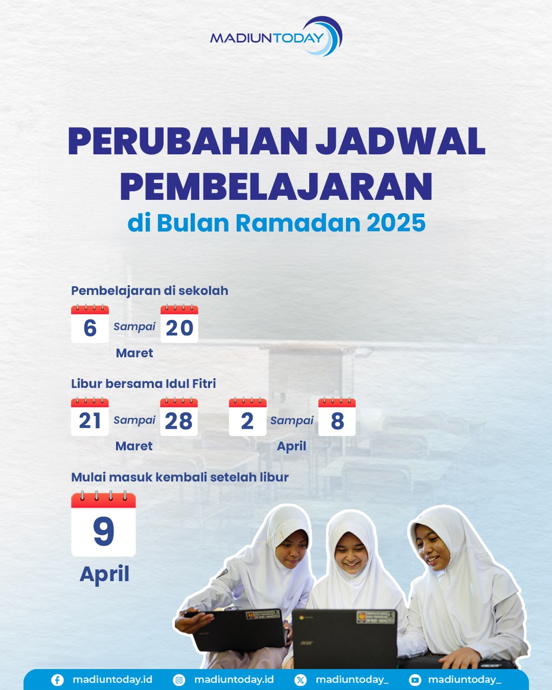 MADIUN – Skema pembelajaran di sekolah pada Ramadan 2025 bakal kembali berubah lagi. Sebelumnya, pemerintah menetepakan pembelajaran di sekolah di Bulan Ramadan melalui Surat Edaran Bersama (SEB) tiga menteri Nomor 2 Tahun 2025, Nomor 2 Tahun 2025, dan Nomor 400.1/320/SJ. Dalam SEB itu, pembelajaran di sekolah 6-25 Maret. Namun, belakangan pembelajaran di sekolah dikurangi.