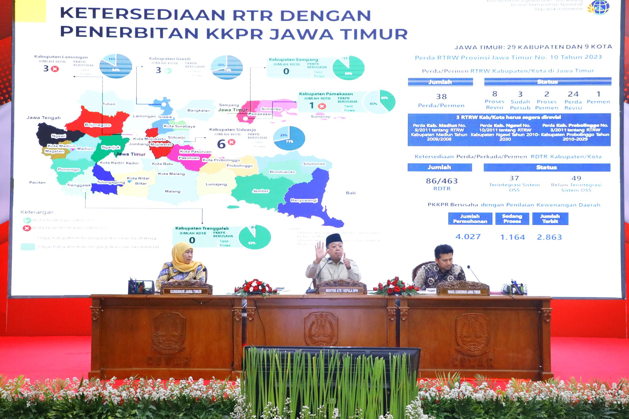 SURABAYA – Percepatan pengentasan kemiskinan menjadi salah satu fokus pemerintah. Rapat koordinasi (Rakor) tingkat Jawa Timur pun digelar. Rakor dipimpin Gubernur Jawa Timur Khofifah Indar Parawansa di Gedung Grahadi Surabaya, Minggu (9/3). Rakor dihadiri kepala daerah se-Provinsi Jawa Timur. Tak terkecuali Wakil Wali Kota Madiun F Bagus Panuntun yang mewakili Wali Kota Dr. Maidi. Tak hanya itu, ada juga Menteri Agraria dan Tata Ruang/Kepala Badan Pertanahan Nasional (ATR/BPN), Nusron Wahid dan Menteri Sosial Saifullah Yusuf sebagai pemateri.
