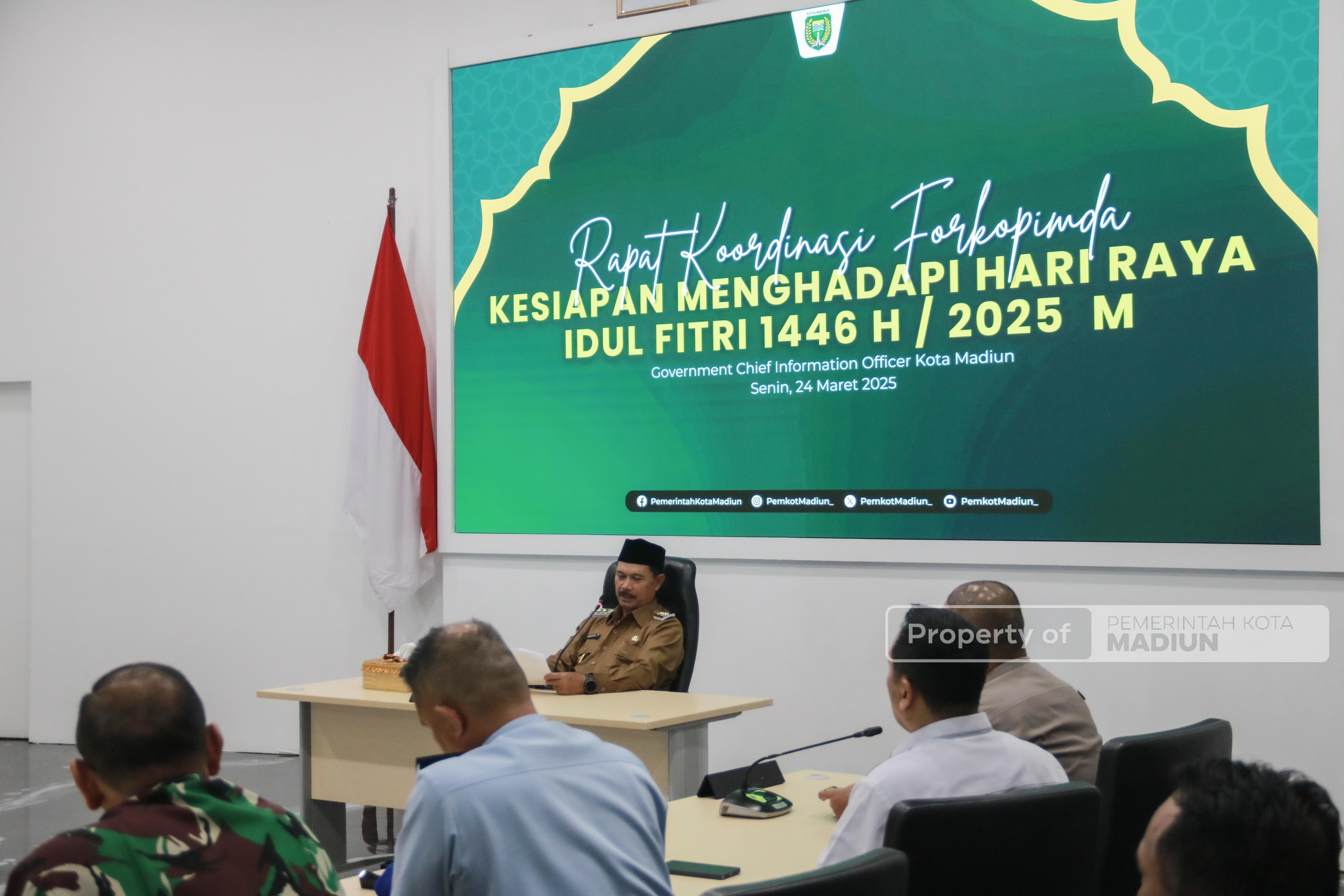MADIUN – Perayaan Hari Raya Idul Fitri 2025 tinggal menghitung hari. Berbagai persiapan terus dilakukan Pemerintah Kota Madiun menyambut lebaran tersebut. Mulai dari segi keamanan, kenyamanan, hingga pelayanan kepada masyarakat. Rapat koordinasi (rakor) pun digelar, Senin (24/3). Rakor bersama Forkopimda Kota Madiun itu dipimpin langsung Wali Kota Madiun Dr. Maidi.