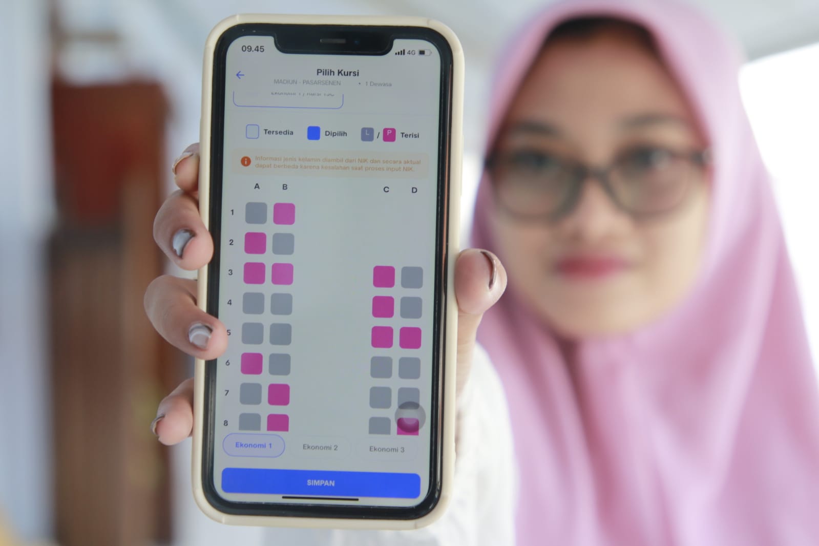 Kursi berwarna pink menandakan bahwa tempat duduk tersebut telah dipesan oleh penumpang perempuan, sehingga pengguna lain dapat memilih kursi di sebelahnya untuk memastikan kenyamanan perjalanan.