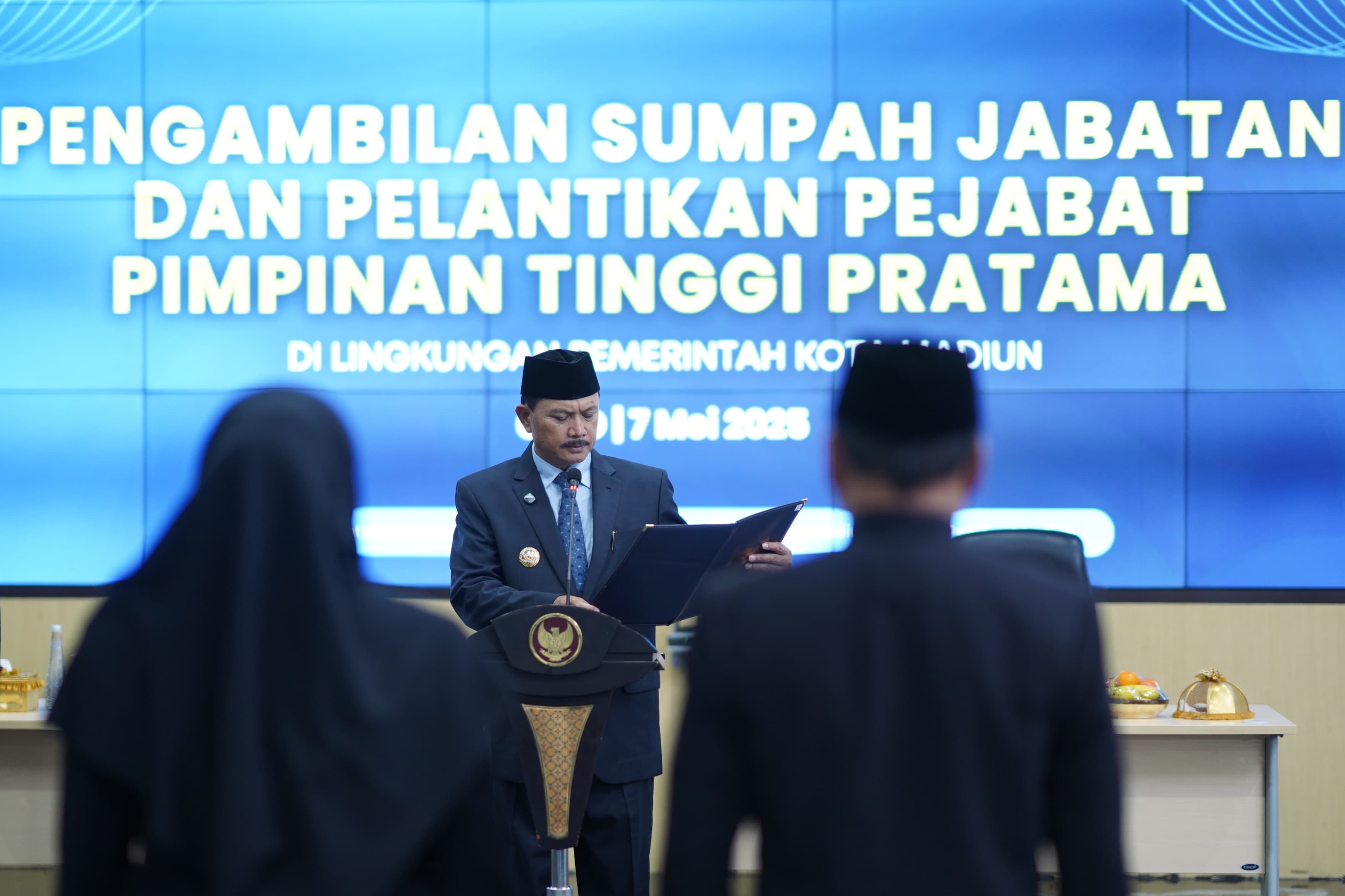 MADIUN - Untuk pertama kalinya setelah pelantikan, Wali Kota Madiun Dr. Maidi merotasi Aparatur Sipil Negara (ASN) di lingkup Pemerintah Kota Madiun. Lima pejabat pimpinan tinggi pratama menjalani pengambilan sumpah jabatan dan pelantikan di Gedung GCIO Dinas Kominfo Kota Madiun, Rabu (7/6).