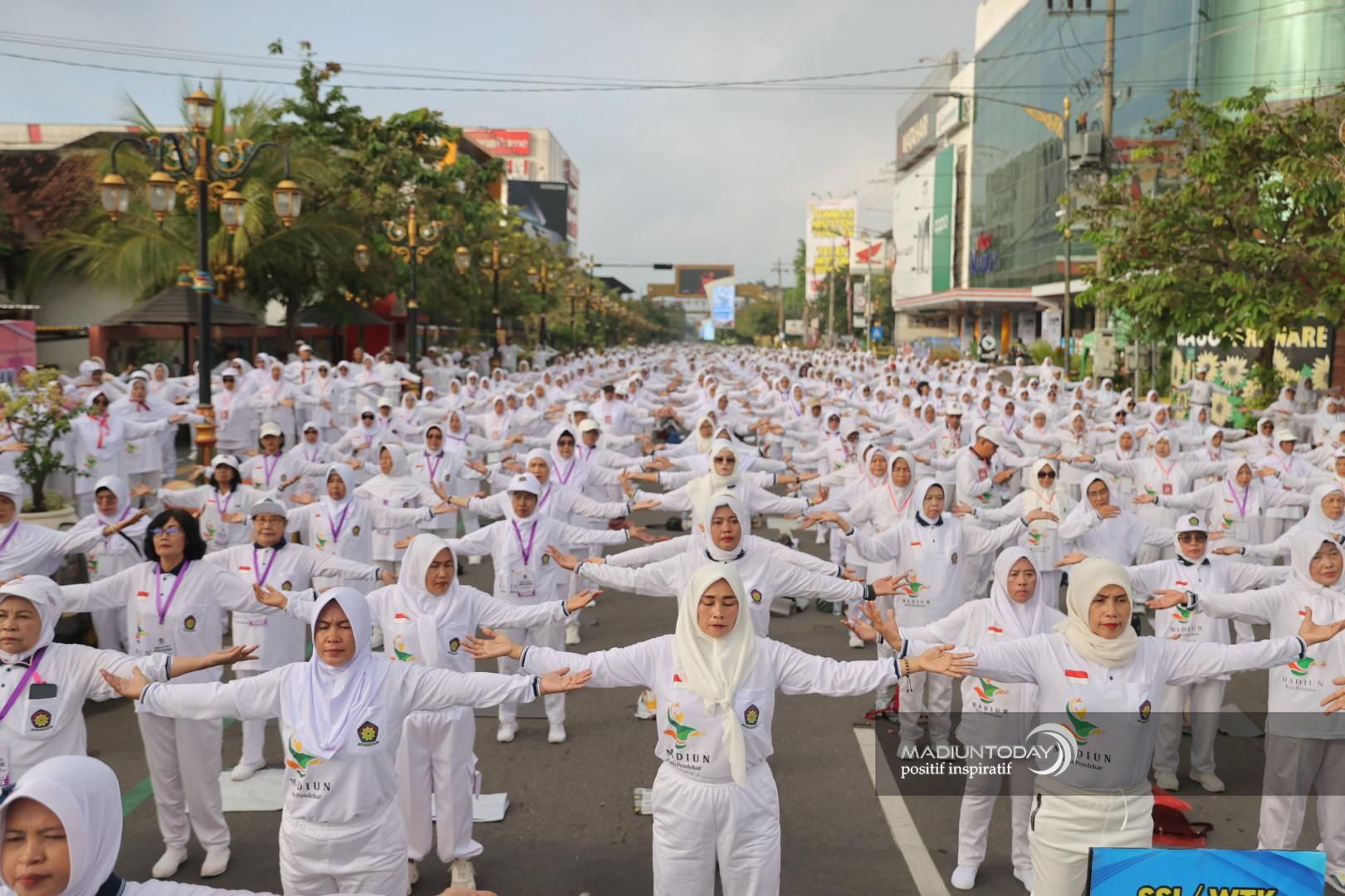 Puluhan ribu lansia dari berbagai daerah di Indonesia berkumpul di Pahlawan Street Center (PSC) dan menggelar Senam Sehat Indonesia (SSI), Senin (12/5). Dihadiri Wali Kota Madiun Dr. Maidi dan Wakil Wali Kota Madiun F. Bagus Panuntun, para opa-oma tampak lincah mengikuti gerakan senam dari instruktur profesional.