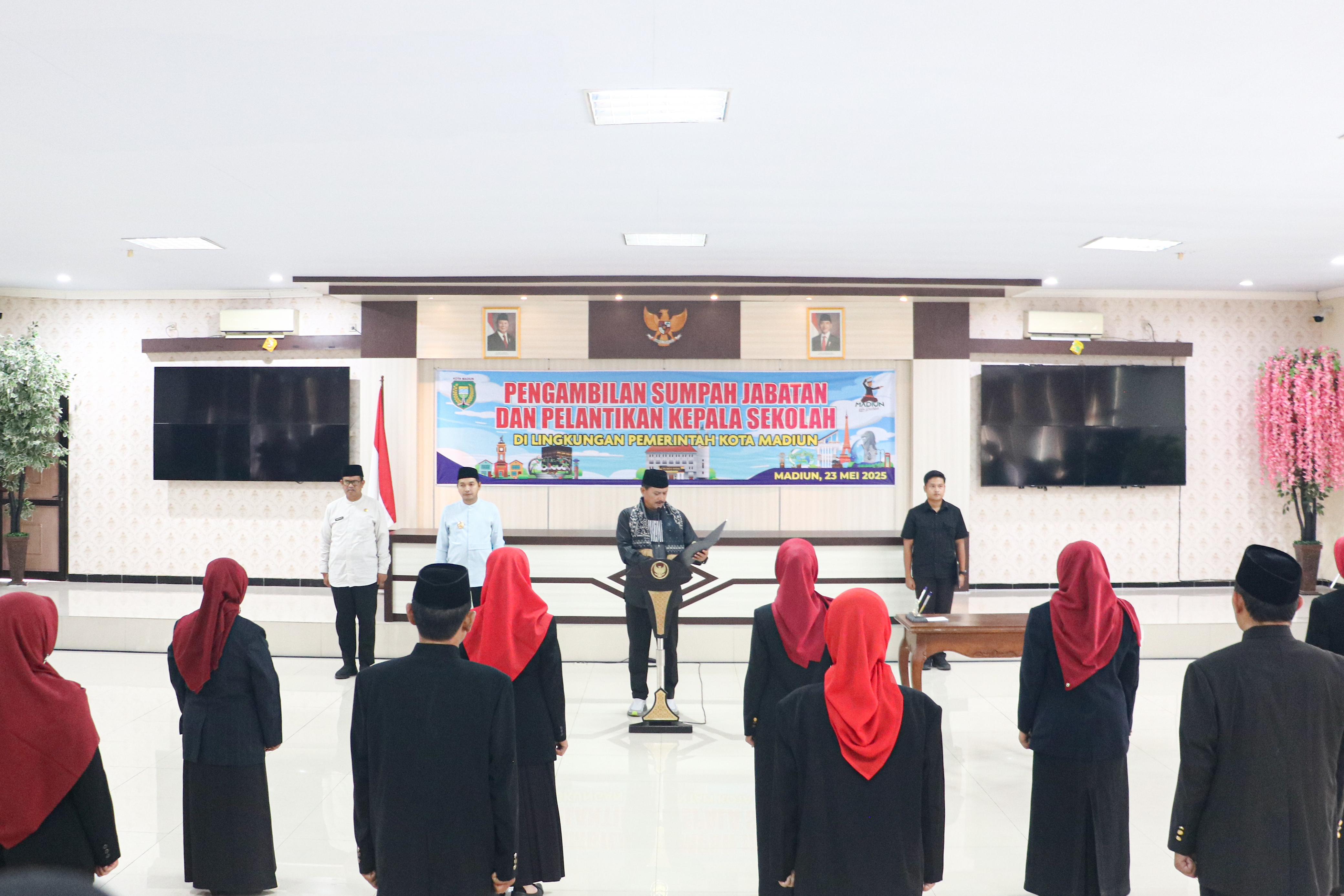 MADIUN – Pemerintah Kota Madiun kembali menegaskan komitmennya dalam meningkatkan mutu pendidikan melalui pelantikan kepala sekolah baru tingkat SD dan SMP. Sebanyak 16 kepala sekolah resmi dilantik oleh Wali Kota Madiun, Dr. Maidi, dalam acara yang digelar di Kantor Dinas Pendidikan Kota Madiun pada Jumat (23/5).