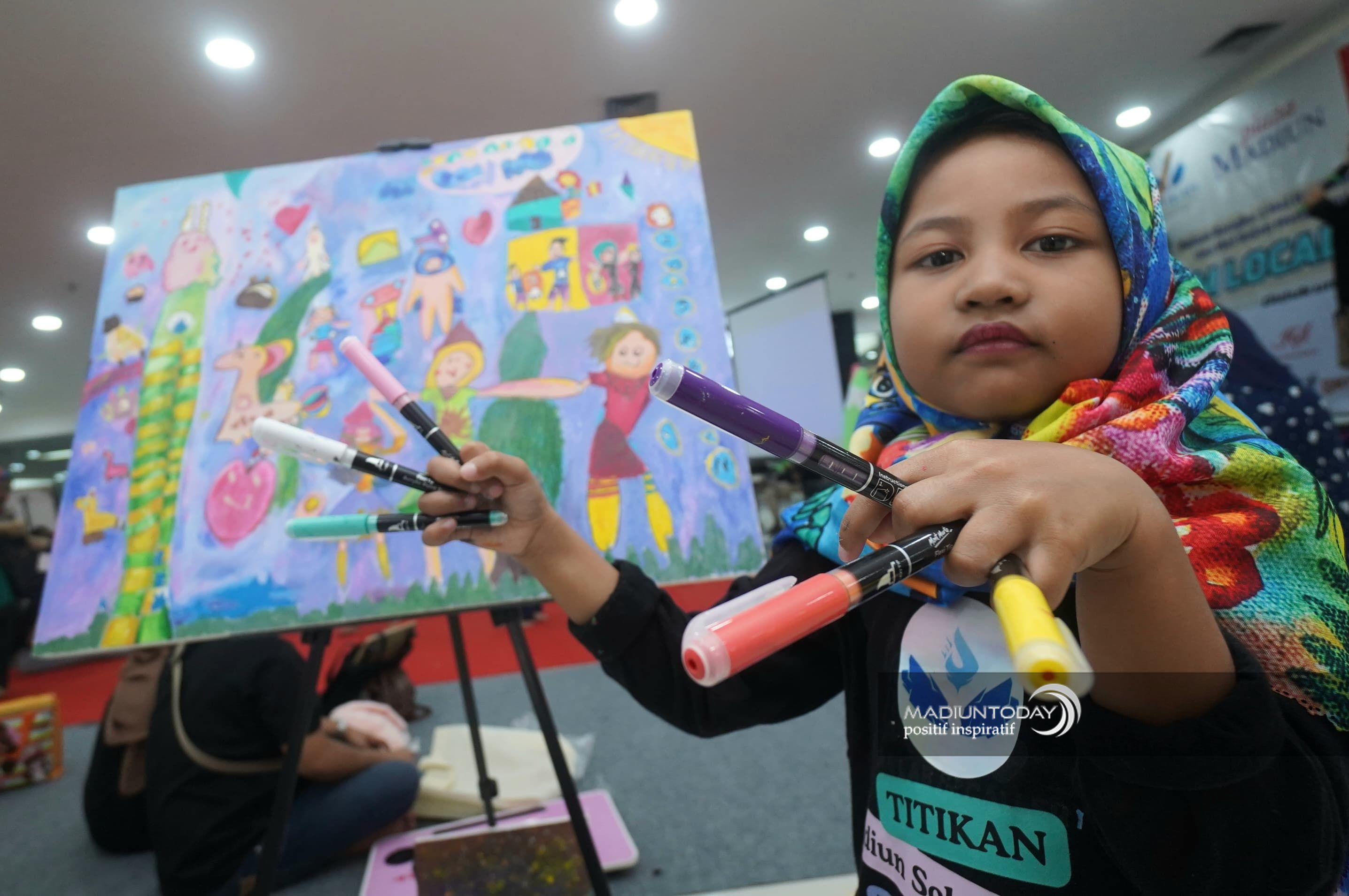 MADIUN - Suasana penuh warna memenuhi Atrium Plaza Madiun pada Minggu (25/5) pagi. Ratusan pengunjung tampak antusias mengamati satu per satu lukisan dan gambar yang dipajang rapi di sepanjang area pameran. Karya-karya penuh imajinasi dan emosi terpampang di kanvas, kertas, hingga kaos putih, semuanya hasil tangan kreatif anak-anak dari berbagai usia.