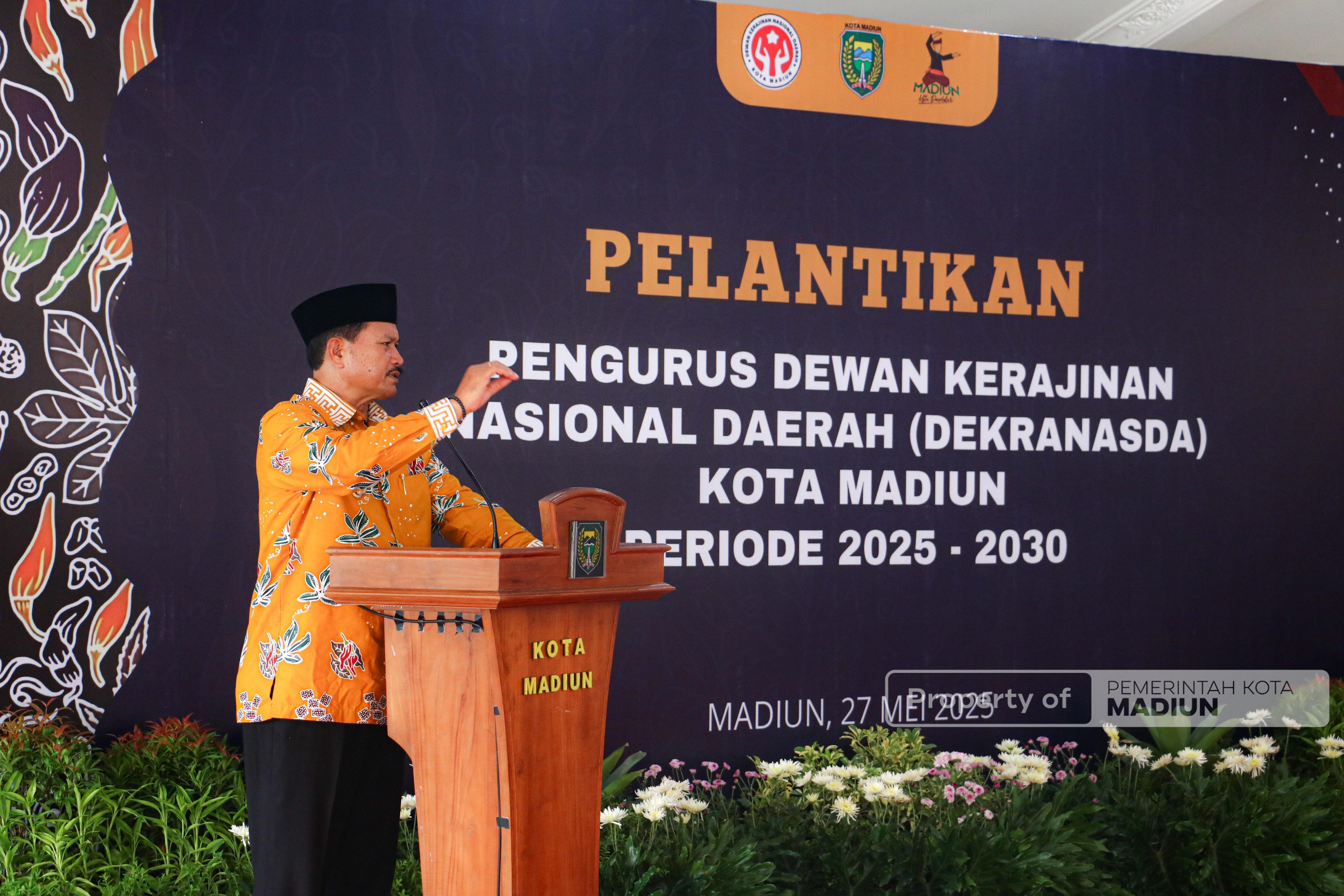 MADIUN - Wali Kota Madiun Dr.Maidi melantik pengurus Dewan Kerajinan Nasional Daerah (DEKRANASDA) Kota Madiun,Selasa (27/5) di Pendopo Rumah Dinas Wali Kota Madiun. Acara ini di gelar sebagai simbol pengukuhan pengurus baru Dekranasda periode 2025-2030. Pengukuhan ini bertujuan untuk meningkatkan peran Dekranasda dalam mengembangkan dan meningkatkan ekonomi kreatif di Kota Madiun.