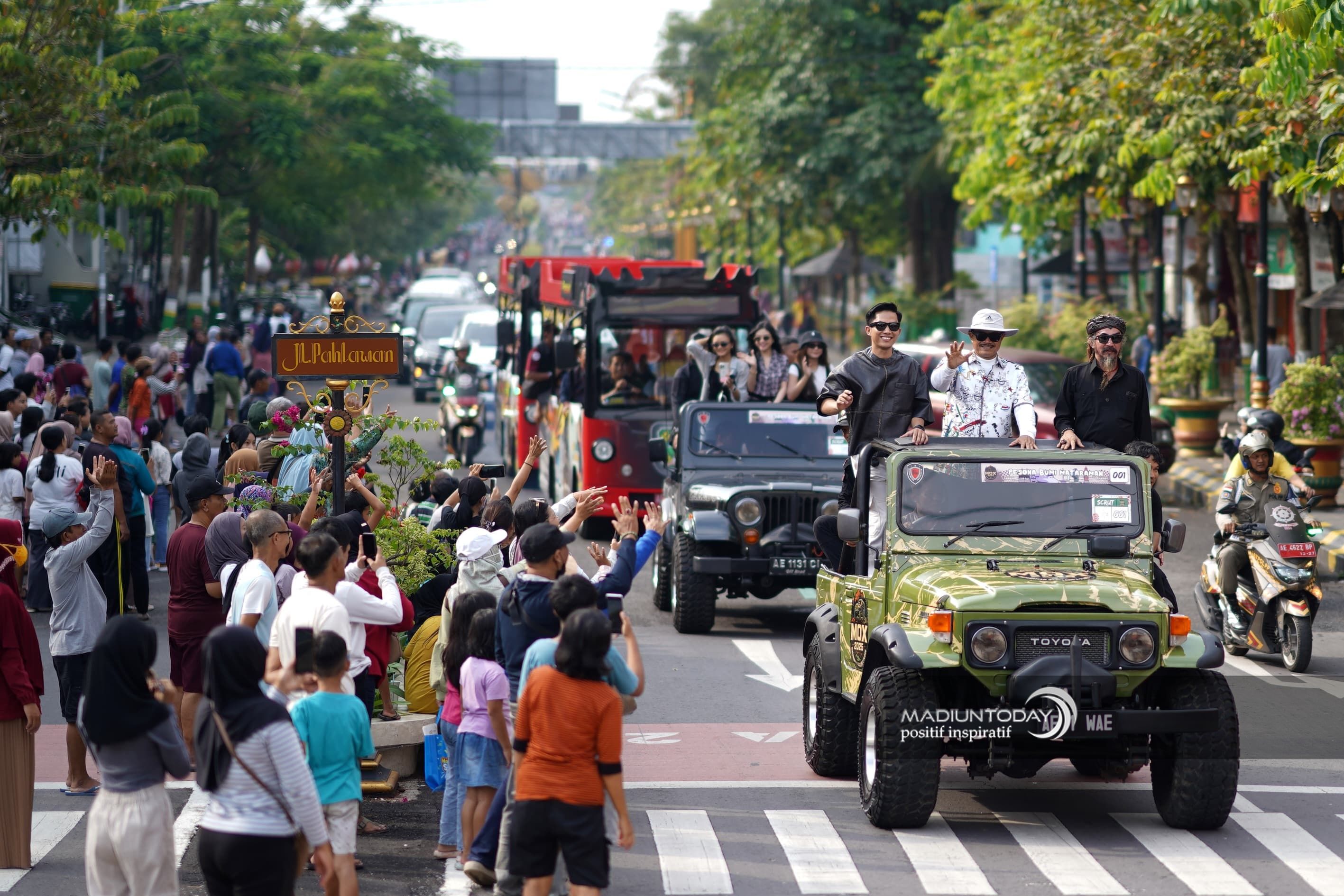 Sejumlah artis ibu kota tengah berada di Kota Madiun. Ya sejumlah artis itu tengah berada di Kota Madiun dalam rangkaian acara Kilau Raya MNC. Sebelum puncak acara, para artis berkeliling di Jantung Kota Madiun, Sabtu (31/5) sore. Didampingi Wali Kota Madiun Dr. Maidi dan Wakil Wali Kota F Bagus Panuntun, Limbad dkk juga menyapa masyarakat Kota Pendekar. Kehadiran mereka memang sudah dinanti masyarakat yang menunggu di tepi jalan yang dilewati. Puncak Kilau Raya MNC sendiri berlangsung di Stadion Wilis Kota Madiun malam ini. (dspp/agi/madiuntoday)
