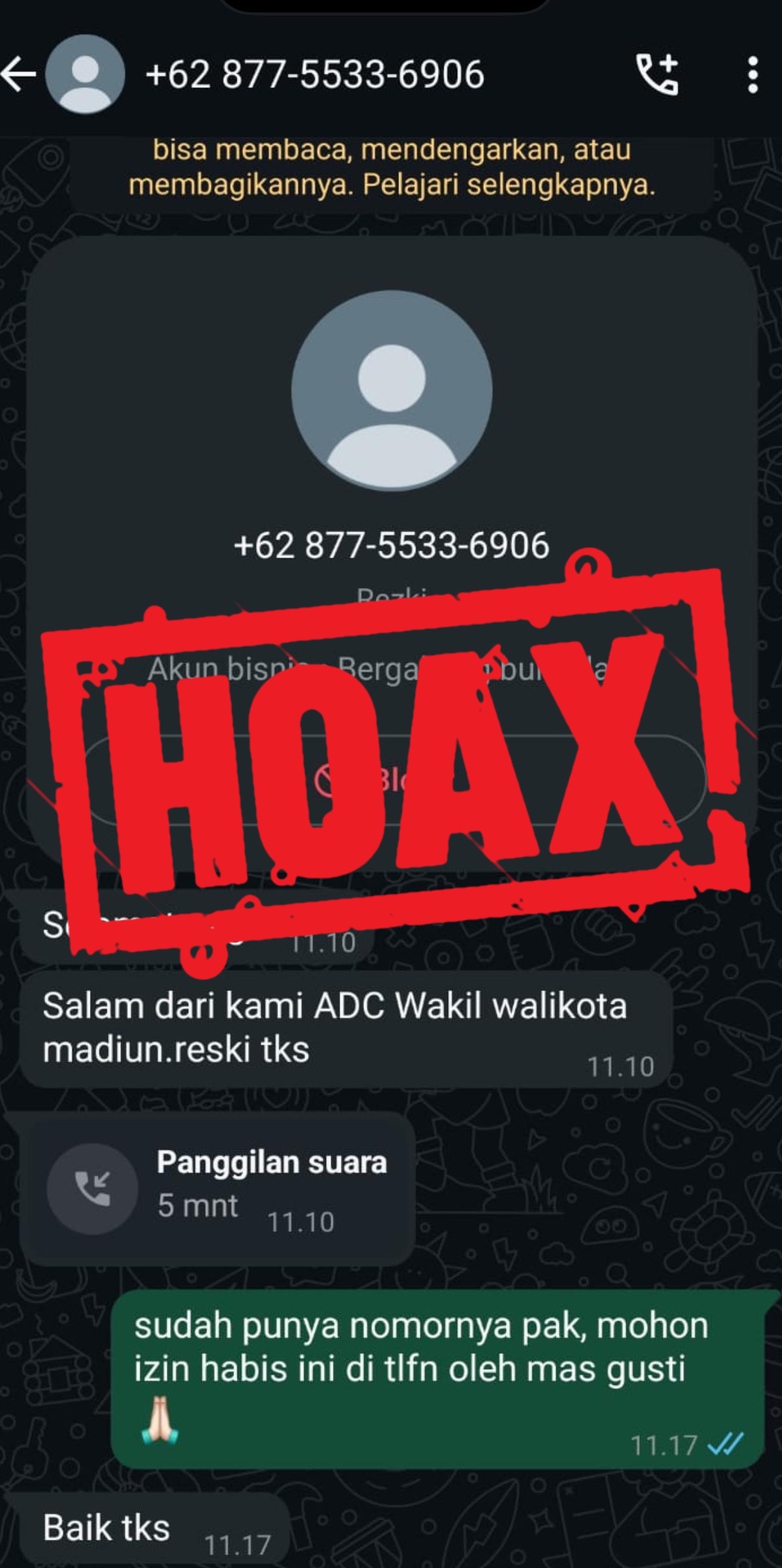 Namun setelah ditelusuri, nomor tersebut bukan bagian dari tim resmi Pemerintah Kota Madiun, dan identitas ADC Wakil Wali Kota tidak pernah dikaitkan dengan nomor tersebut.