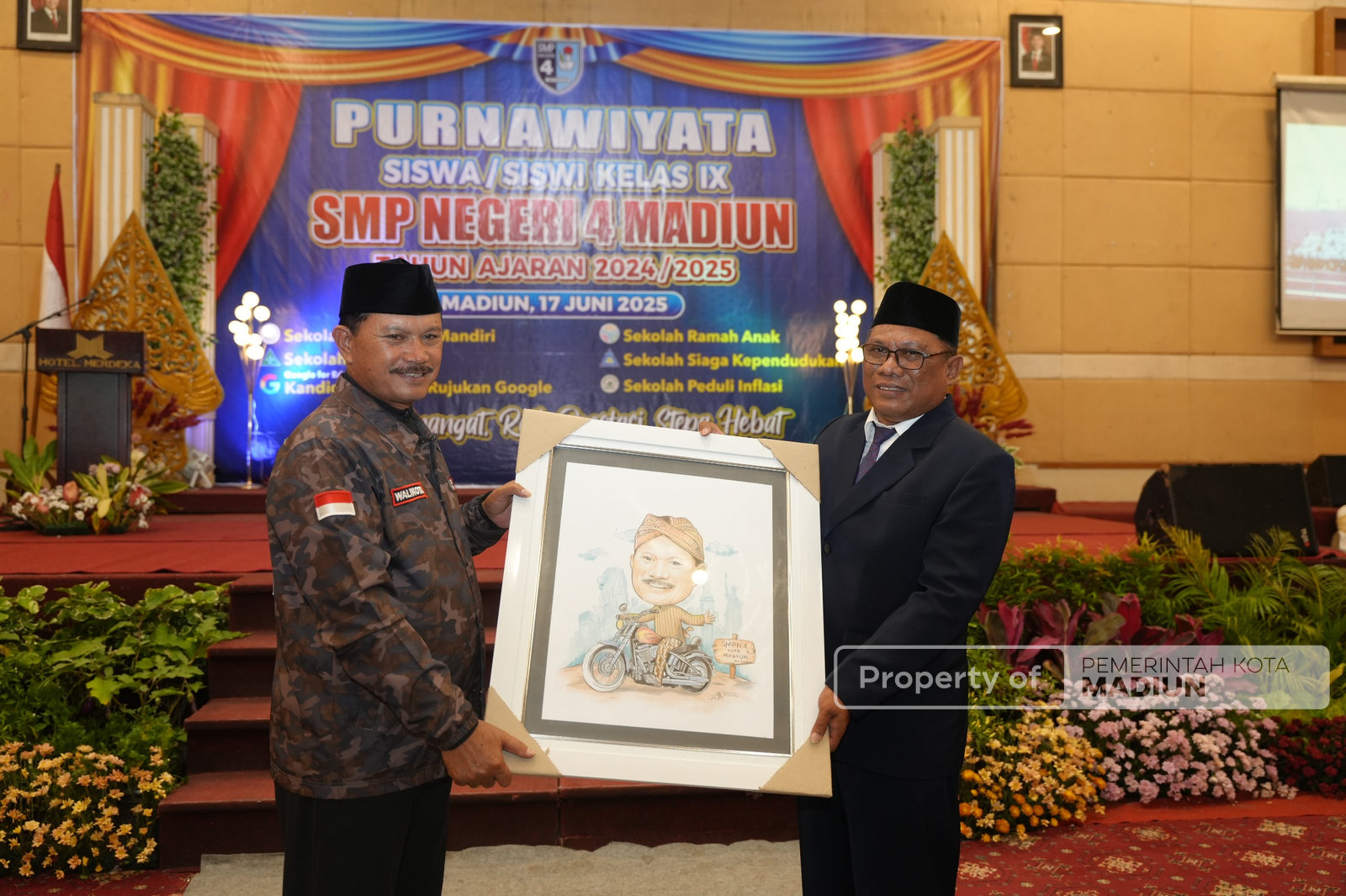MADIUN – Wali Kota Madiun, Dr. Maidi, menghadiri acara purnawiyata siswa kelas IX SMP Negeri 4 Kota Madiun yang digelar di Hotel Merdeka pada Selasa (17/6). Acara tersebut berlangsung khidmat dan penuh haru, diikuti oleh para siswa, guru, dan orang tua wali murid.