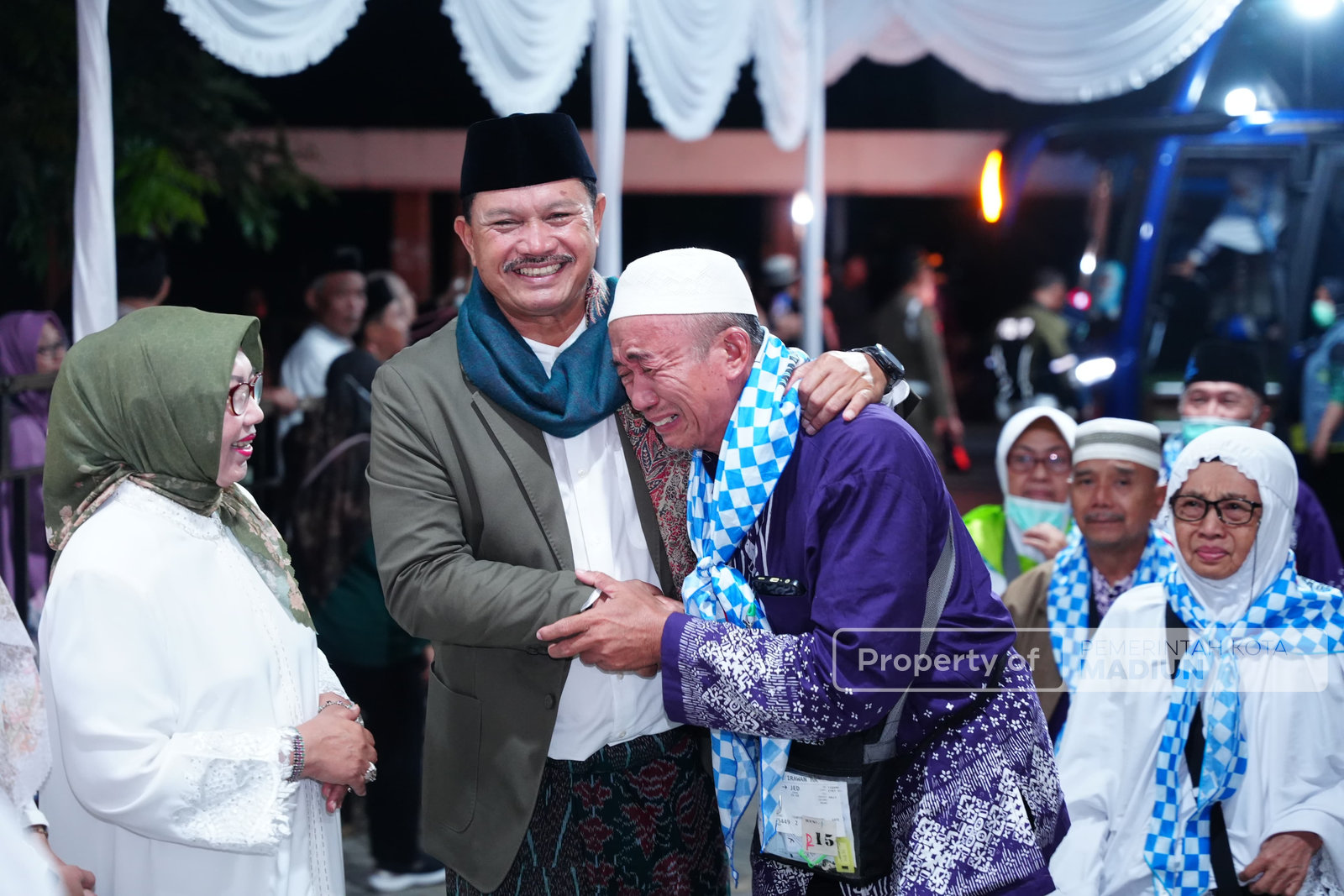 MADIUN- Suasana haru dan penuh kebahagian menyelimuti penyambutan kepulangan jamaah haji asal Kota Madiun kloter 52 yang tiba di Asrama Haji, pada Jumat (27/6) malam. Sebanyak 152 jamaah yang tergabung dalam kloter ini, disambut hangat oleh keluarga , kerabat, serta jajaran Pemerintah Kota Madiun.