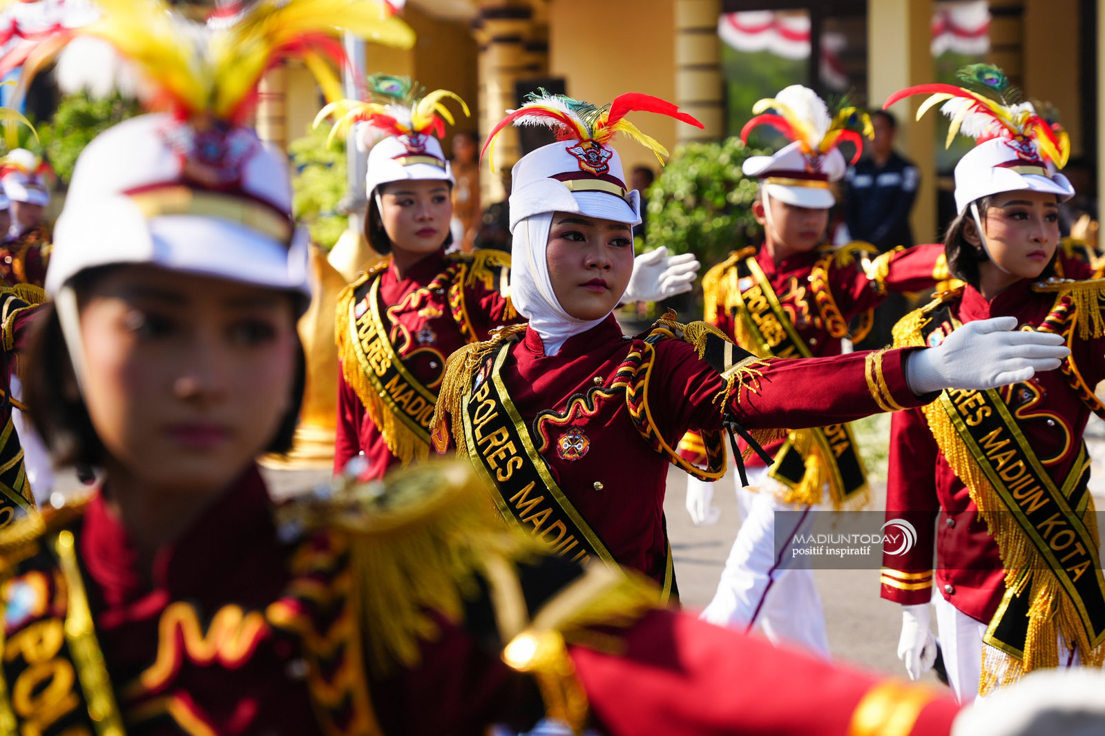 Dengan seragam lengkap, topi berbulu warna-warni, dan barisan rapi nan kompak, mereka menunjukkan aksi baris-berbaris penuh disiplin. Gerakannya energik, dengan ekspresi penuh percaya diri.