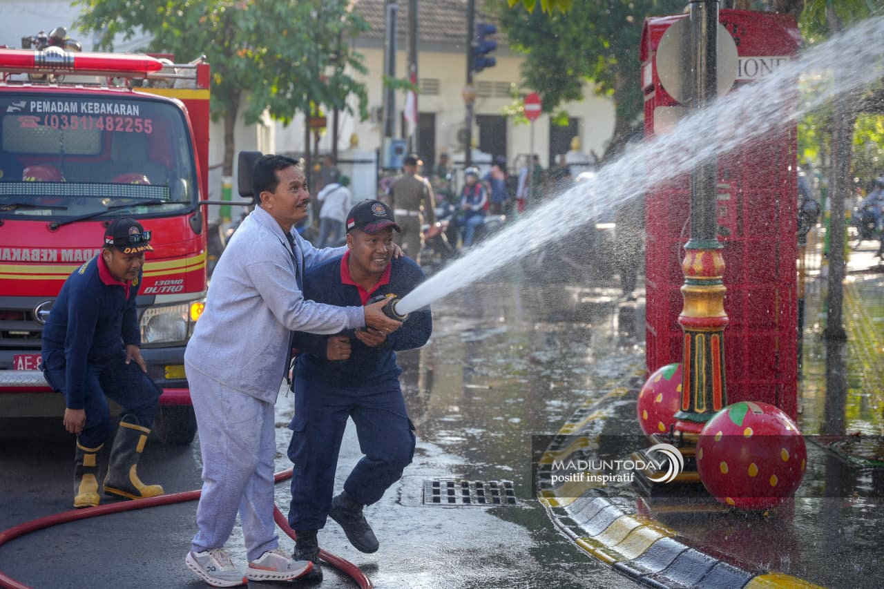 Tak sekadar membersihkan jalanan, Dr. Maidi juga mengerahkan armada pemadam kebakaran (damkar) untuk menyiram sekaligus membersihkan pepohonan dari sampah dan debu jalanan.