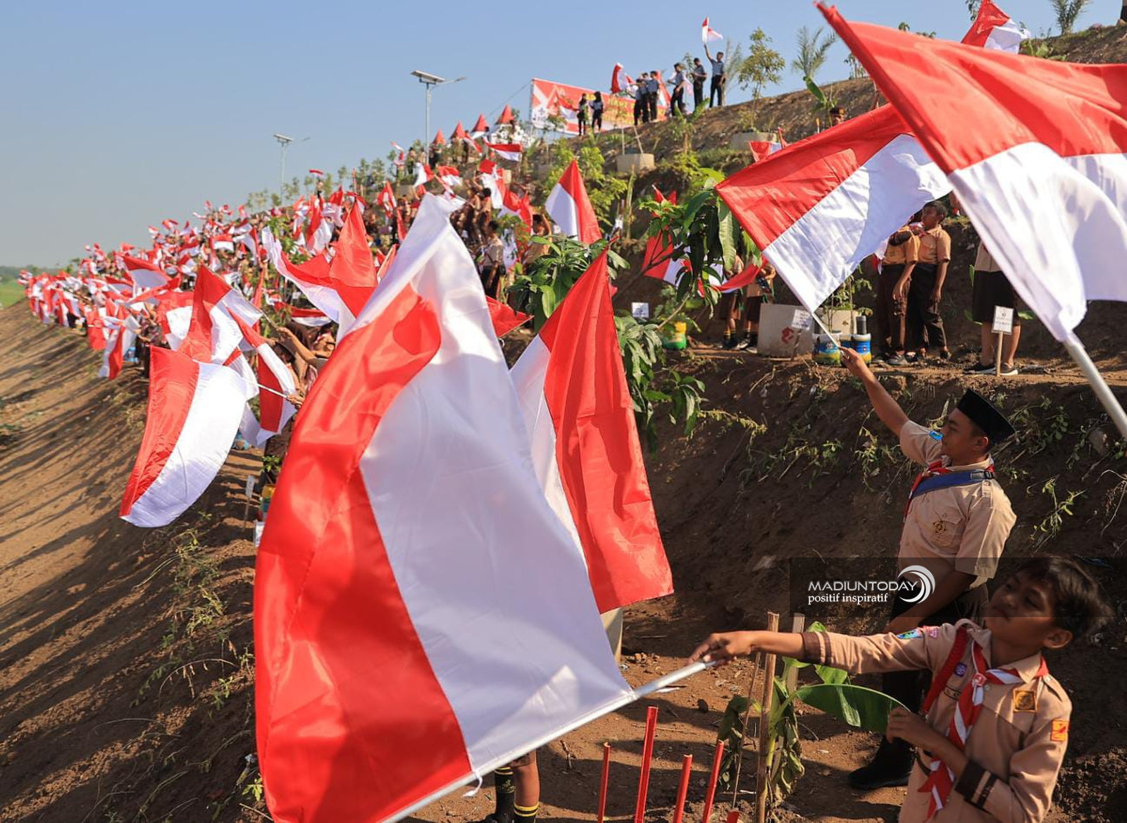 MADIUN – Sebanyak 2.000 bendera Merah Putih berkibar di TPA Winongo, Kelurahan Winongo, Manguharjo, Kota Madiun. Dikibarkan ribuan siswa-siswi, aksi tersebut digelar dalam rangka peringatan Hari Pramuka ke-64 serta HUT ke-80 Kemerdekaan RI.