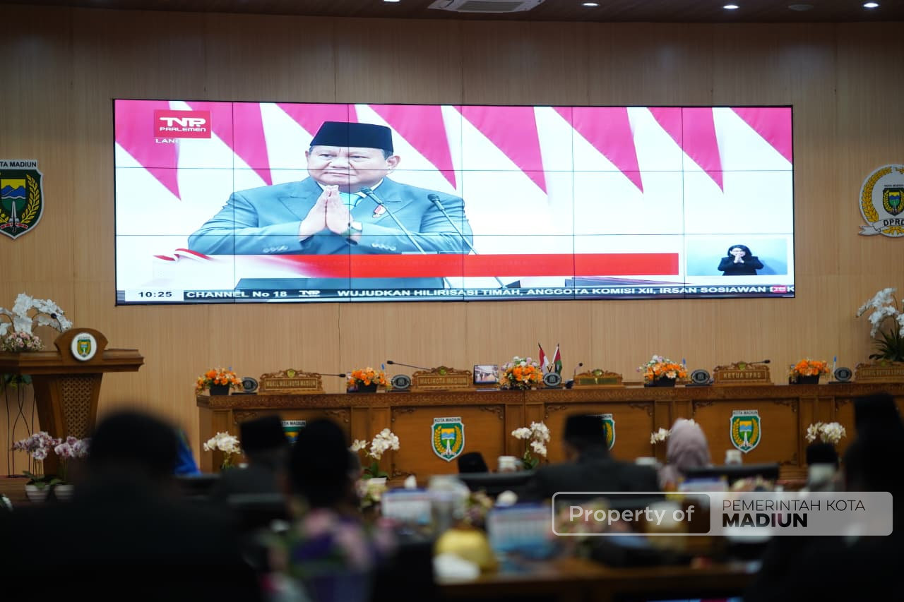 MADIUN – Pidato Kenegaraan resmi disampaikan Presiden RI Prabowo Subianto, Jumat (15/8). Secara virtual, pidato dalam rangka HUT ke-80 Kemerdekaan RI disaksikan dalam Rapat Paripurna Istimewa yang digelar DPRD Kota Madiun.