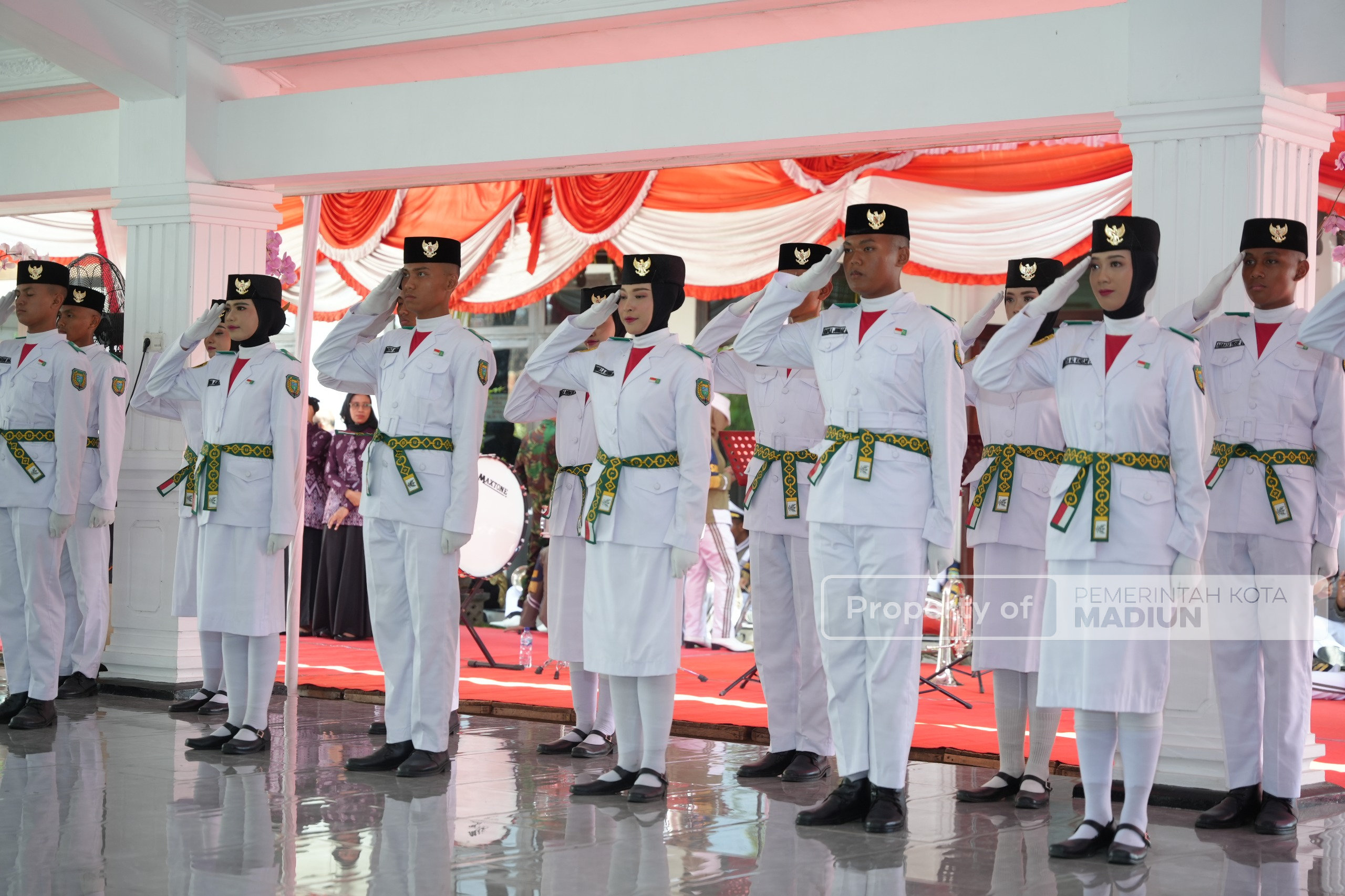 MADIUN – Pasukan Pengibar Bendera Pusaka (Paskibraka) Kota Madiun resmi dikukuhkan. Pengukuhan dilakukan Wali Kota Madiun Dr. Maidi di rumah dinasnya, Jumat (15/8). Prosesi pengukuhan juga dihadiri jajaran forum koordinasi pimpinan daerah (forkopimda) setempat.
