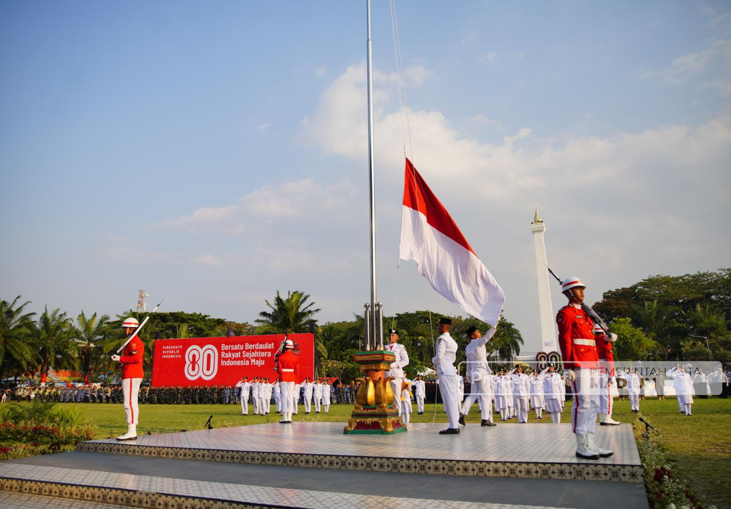 Tim paskibraka penurunan bendera kemudian melipat dan menyerahkan bendera Merah Putih kepada Aurelia Michiko Syahbany Nugroho dari SMAN 1 Madiun selaku pembawa baki. Bendera Merah Putih yang diturunkan kemudian diserahkan kepada inspektur upacara sekaligus menandai berakhirnya rangkaian upacara HUT ke-80 Kemerdekaan RI.
