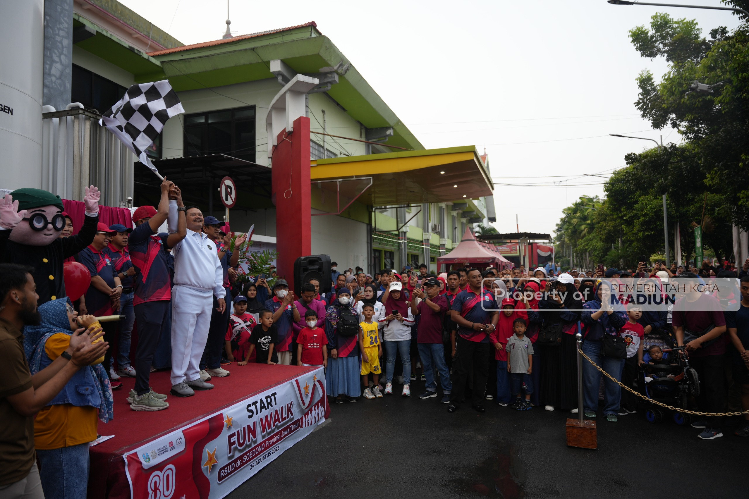 MADIUN – Semangat serta semarak HUT ke-80 Kemerdekaan RI di Kota Madiun belum habis. Terkini, RSUD dr Soedono menggelar jalan santai, Minggu pagi (24/8). Wali Kota Madiun Dr. Maidi hadir sekaligus membuka secara resmi jalannya acara.