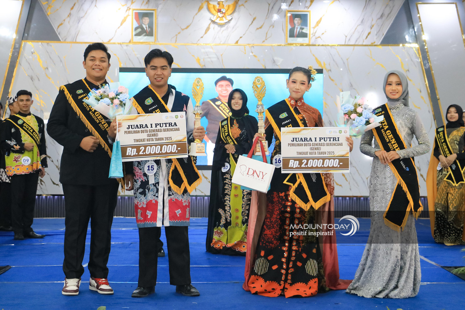 MADIUN – Sorak-sorai meriah mengiringi final Pemilihan Duta Generasi Berencana (GenRe) Kota Madiun 2025 di Wisma Haji, Sabtu (20/9). Dari puluhan peserta yang bersaing ketat, Christ Japeth dari SMAN 6 Madiun dan Keira Charletta dari SMAN 1 Madiun akhirnya keluar sebagai juara pertama.