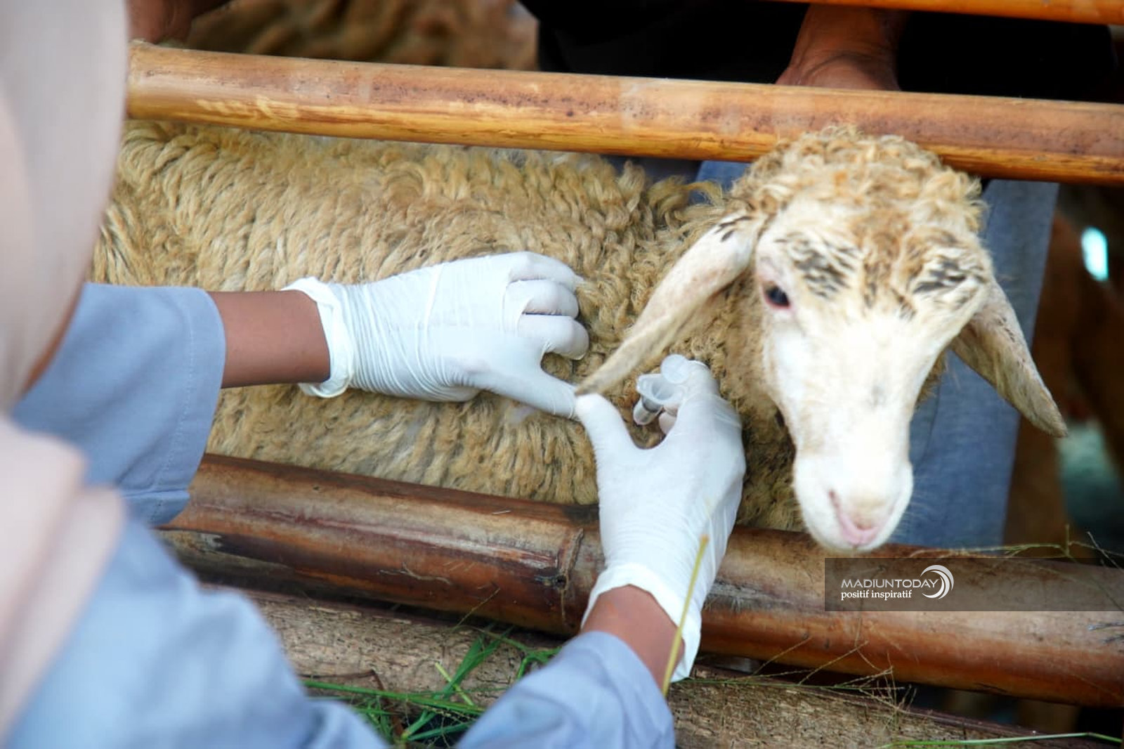 Petugas tampak menyuntikkan vaksin ke ternak, sekaligus memberikan vitamin dan melakukan pengecekan kesehatan. Vaksinasi ini menyasar lima hingga enam lokasi berbeda di Kota Madiun.