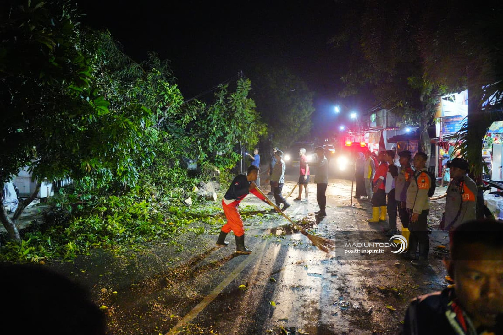 Hujan dengan intensitas deras disertai angin kencang baru saja melanda wilayah Kota Madiun, Jumat (17/10) sore. Hujan sekitar setengah jam tersebut cukup memberikan dampak di Kota Pendekar. Sejumlah pohon dilaporkan tumbang. Beberapa mengenai rumah warga. Selain itu juga terdapat laporan atap rumah yang rusak. Petugas gabungan pun segera turun memberikan penanganan. Seperti yang terlihat di Jalan Apotik Hidup dan di Kelurahan Rejomulyo ini. Hujan dengan intensitas deras disertai angin diprediksi masih akan terjadi ke depan. Karenanya, masyarakat diimbau meningkatkan kewaspadaan. (Rams/rdh/agi/madiuntoday).