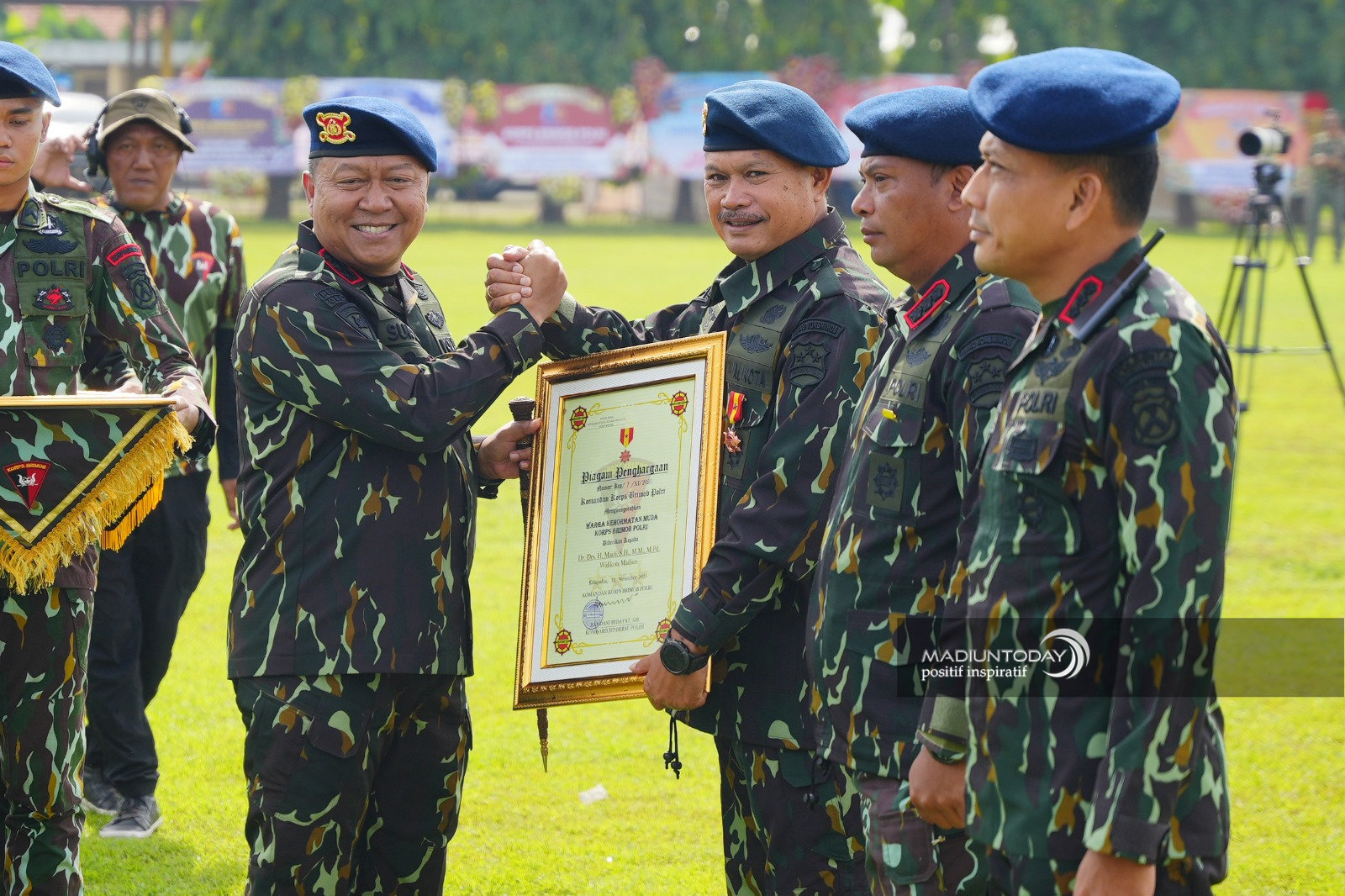 SIDOARJO – HUT ke-80 Korp Brimob Polda Jatim meninggalkan kesan tersendiri untuk Wali Kota Madiun Dr. Maidi. Bagaimana tidak, orang nomor satu di Kota Pendekar tersebut mendapatkan penghargaan sebagai Warga Kehormatan Muda Korps Brimob Polri. Tak hanya itu, Wali Kota Dr. Maidi juga mendapatkan lencana Wahor Muda Perunggu. Piagam penganugerahan dan lencana diberikan Dansat Brimob Polda Jatim Kombespol Suryo Sudarmadi bersamaan seremonial syukuran HUT di Mako Kompi 3 Batalyon A Pelopor Satuan Brigade Mobil Polda Jatim, Jumat (14/11).
