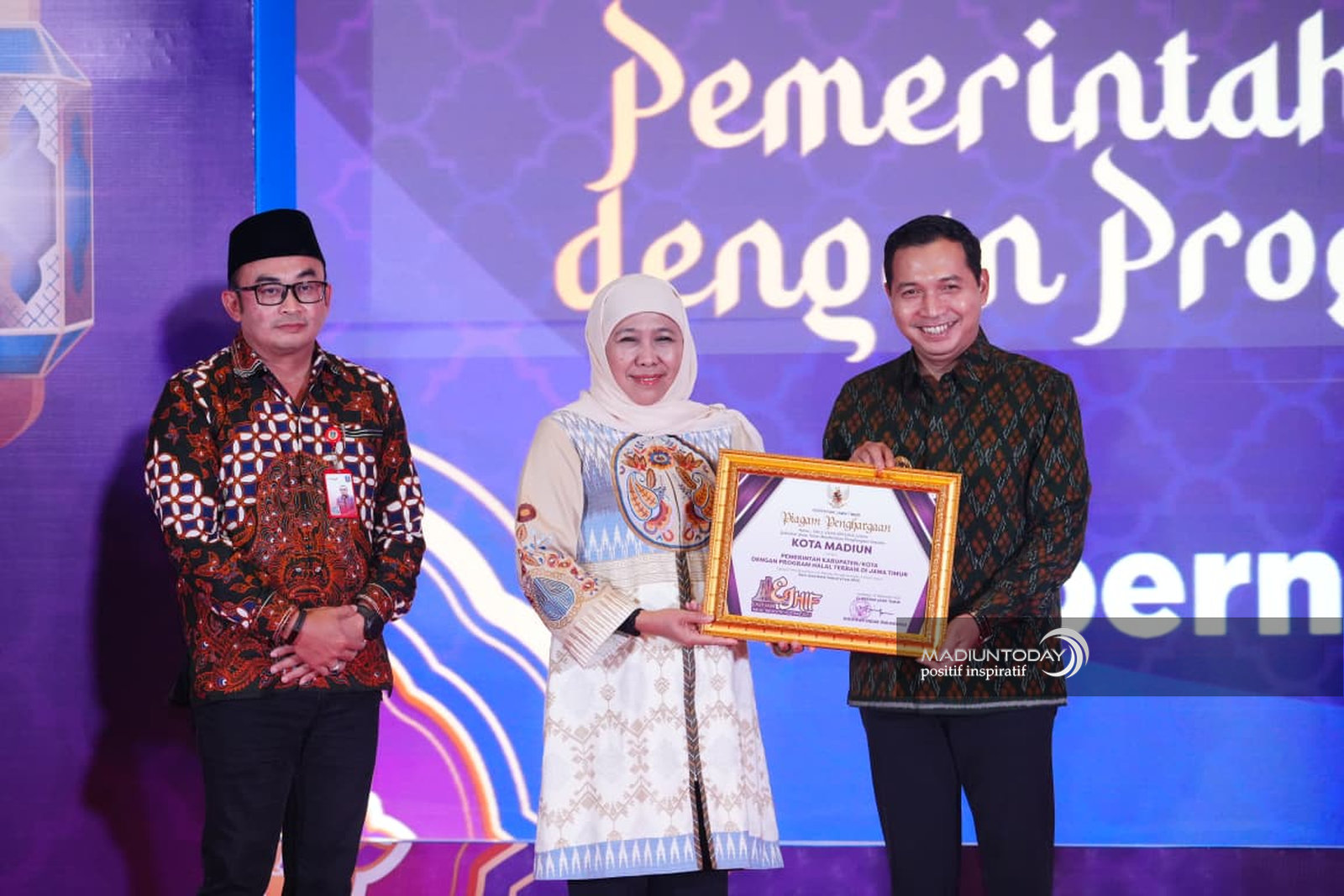 SURABAYA – Penghargaan demi penghargaan terus diraih Kota Madiun. Setelah meraih terbaik I Indonesia’s SDGs Action Awards 2025 dari Bappenas RI, Kota Pendekar meraih penghargaan terbaik untuk program produk halal di J awa Timur. Penghargaan diberikan Gubernur Jawa Timur Khofifah Indar Parawansa dan diterima Wakil Wali Kota Madiun F Bagus Panuntun di Novotel Samator Surabaya, Jumat (21/11) sore.