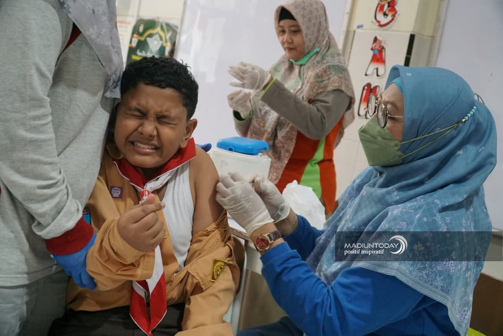 MADIUN - Pelaksanaan Bulan Imunisasi Anak Sekolah (BIAS) kembali menghadirkan momen unik. Ratusan siswa yang menjadi sasaran program tampak menunjukkan beragam ekspresi saat menerima suntikan dari tim Puskesmas Ngegong di SD Al Irsyad, Jumat (21/11).