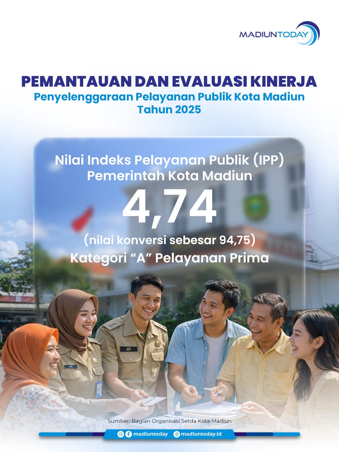 MADIUN – Pelayanan publik di Kota Madiun terbukti baik. Hal itu terlihat dari nilai Indeks Pelayanan Pelayanan Publik (IPP) 2025 Pemerintah Kota Madiun mencapai 4,74 dengan nilai konversi 94,75. Nilai pelayanan publik ini masuk kategori A atau pelayanan prima. Menariknya, IPP ini juga meningkat jika dibanding tahun lalu.