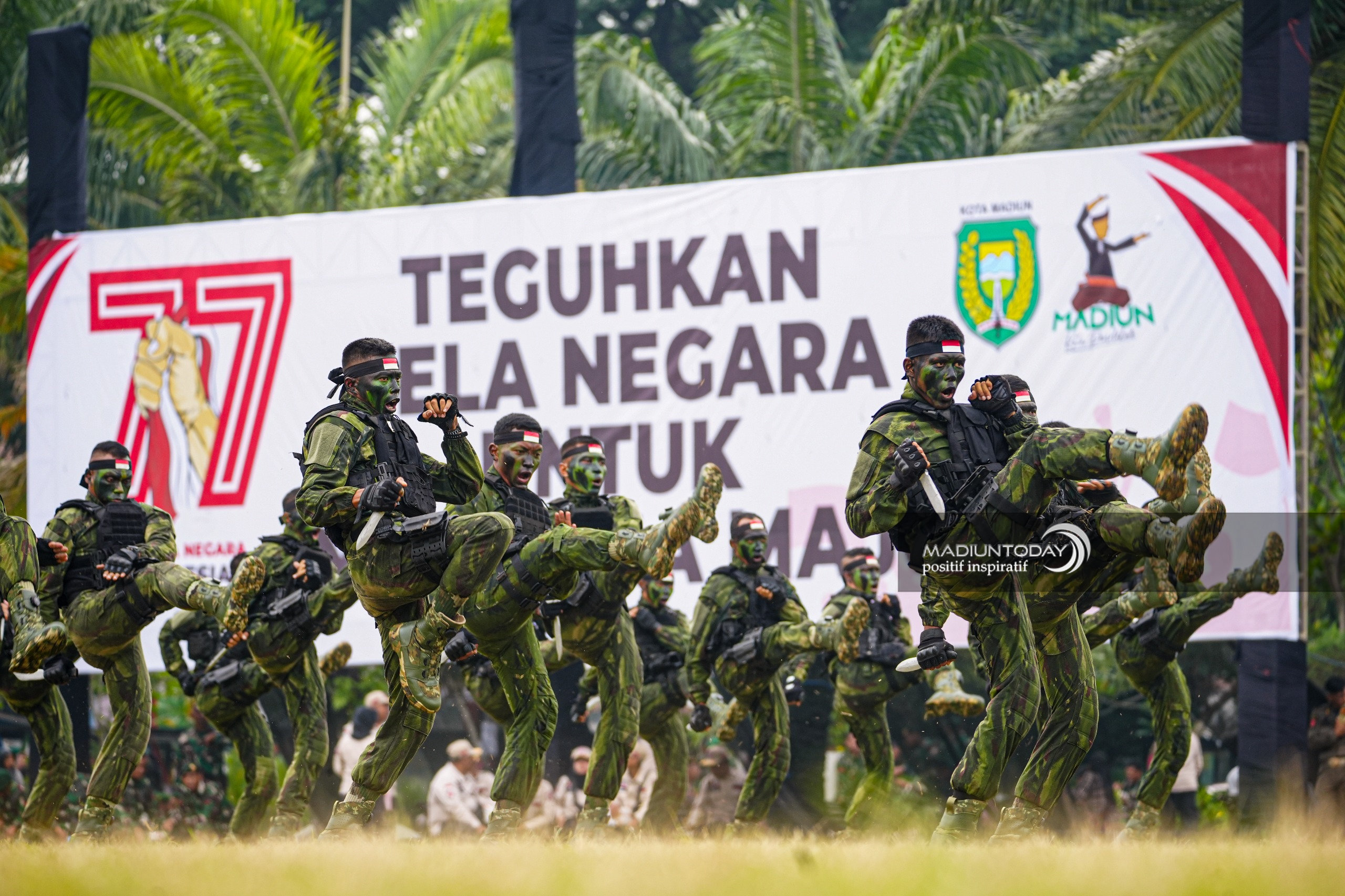 Peringatan Hari Bela Negara ke-77 berlangsung penuh semangat di Alun-Alun Kota Madiun, Jumat (19/12). Tak hanya upacara bendera, peringatan juga dimeriahkan berbagai penampilan menarik dari pemuda Kota Madiun. Mulai dari tarian khas Aceh, kolaborasi pencak silat lintas perguruan, hingga bela diri taktikal dan simulasi pembebasan sandera yang dibawakan secara heroik pasukan Yonif Bajra Yudha 501. Setiap penampilan menyampaikan pesan solidaritas, kepedulian, serta kecintaan terhadap bangsa yang tumbuh dari kebersamaan.