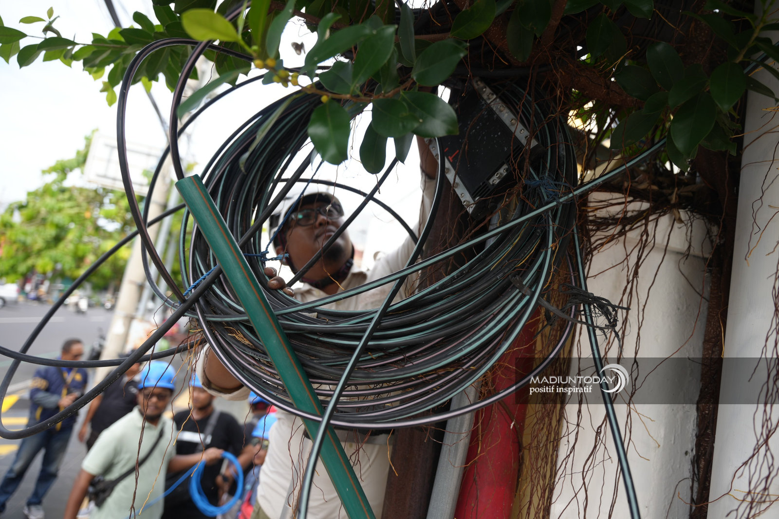 MADIUN – Pemerintah Kota Madiun mulai menata kabel jaringan provider di sepanjang Jalan Panglima Sudirman hingga Jalan Dr. Sutomo, Jumat (9/1). Kegiatan ini merupakan tindak lanjut arahan Wali Kota Madiun Dr. Maidi dalam rapat koordinasi bersama provider sehari sebelumnya. Penataan dilakukan untuk menertibkan jaringan utilitas agar lebih rapi, aman, dan sesuai ketentuan.