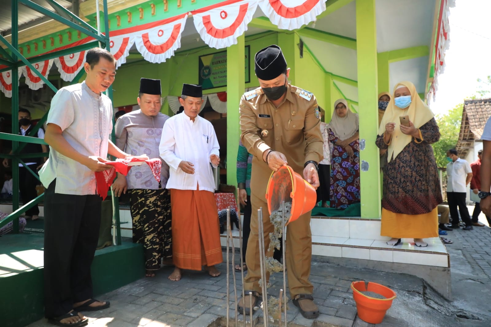 MADIUN - Wali Kota Madiun Maidi menghadiri prosesi peletakan batu pertama untuk renovasi Masjid Baitul Jannah di Kelurahan Tawangrejo, Senin (1/8).