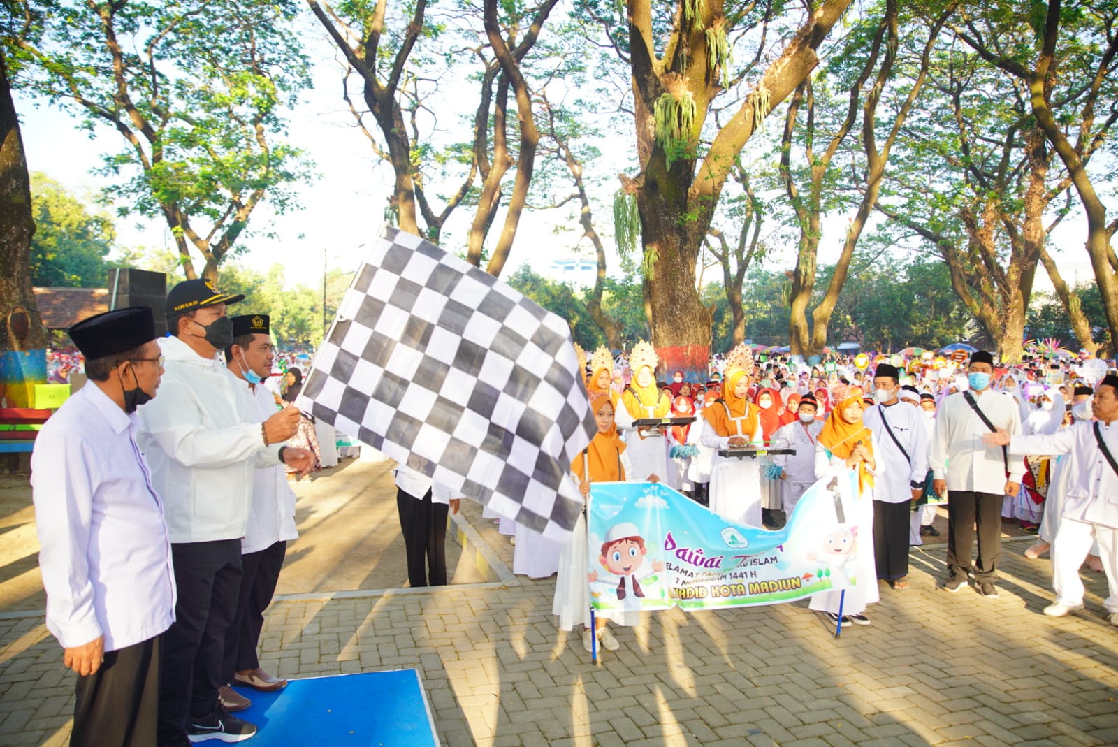 MADIUN – Semarak Muharram terus menggelora di Kota Madiun. Berbagai kegiatan keagamaan mengemuka. Salah satunya, Pawai Taaruf yang diikuti ratusan peserta. Kegiatan yang berpusat di Ngrowo Bening Edupark itu semakin semarak lantaran diberangkatkan Wali Kota Madiun, Maidi, Sabtu (6/8). Biarpun kegiatan yang melibatkan massa dalam jumlah besar mulai diperbolehkan, Wali Kota Maidi tak lupa mengingatkan untuk tetap menjaga protokol kesehatan.