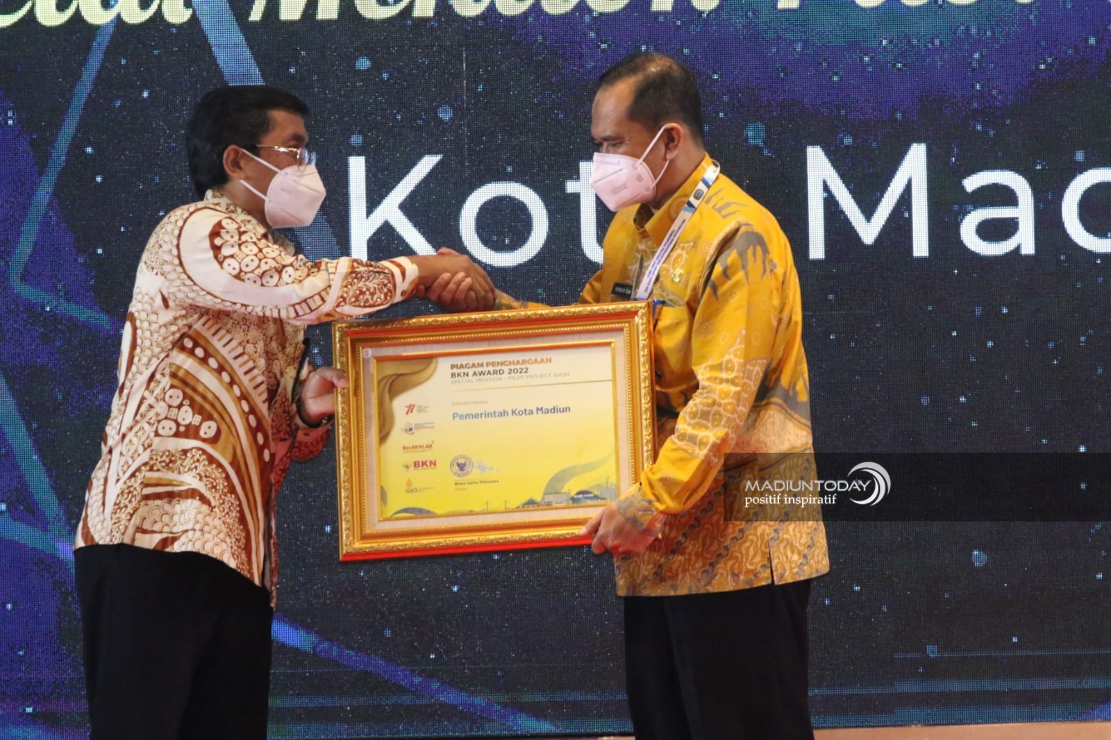 MADIUN – Pemerintah Kota Madiun kembali mengukir prestasi. Terbaru dari urusan kepegawaian. Kota Pendekar mendapatkan BKN Award 2022 kategori Special Mention – Pilot Project SIASN (Sistem Informasi Aparatur Sipil Negara). Kota Madiun dinilai paling siap dan paling aktif dalam menerapkan digitalisasi untuk urusan kepegawaian. Penghargaan diberikan Wakil Kepala BKN Supranawa Yusuf dan diterima Sekda Kota Madiun Soeko Dwi Handiarto di Kota Batu, Rabu (10/8) kemarin.