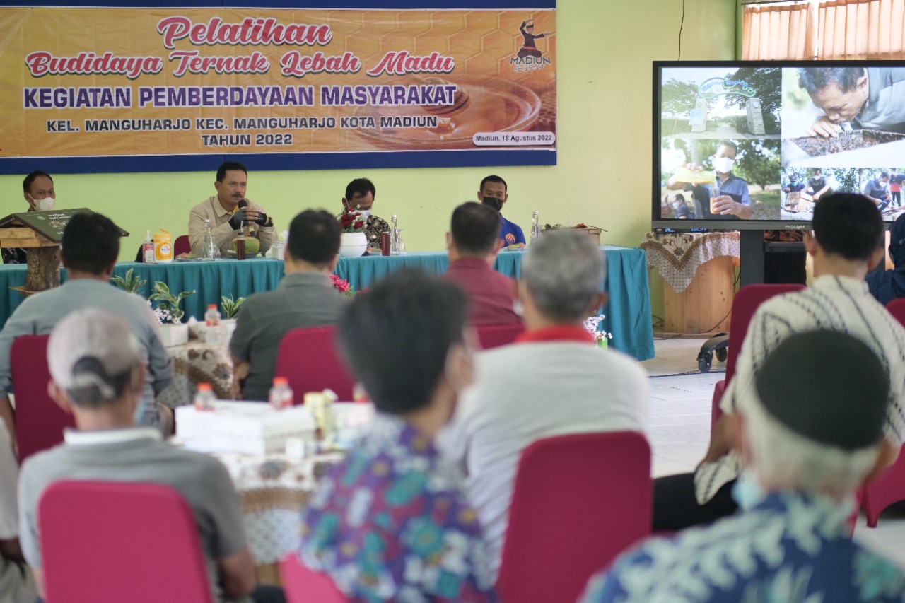 MADIUN – Pelatihan budidaya lebah madu berganti di Kelurahan Manguharjo, Kamis (18/8). Pelatihan diikuti sebanyak 22 peserta masyarakat setempat. Tidak hanya dapat pelatihan langsung dari praktisi, mereka juga mendapatkan bantuan koloni lebah untuk tiap-tiap peserta. Pelatihan semakin menarik lantaran mendapat semangat langsung dari Wali Kota Madiun, Maidi yang hadir memberikan motivasi dan arahan.