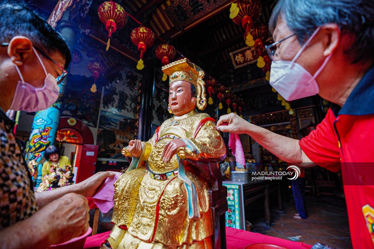 MADIUN - Warga keturunan Tionghoa di Kota Madiun berkumpul di Klenteng TITD Hwie Ing Kiong untuk melaksanakan tradisi Kimsin. Atau, ritual memandikan rupang dewa yang dilakukan sepekan menjelang Tahun Baru Imlek, Minggu (15/1).