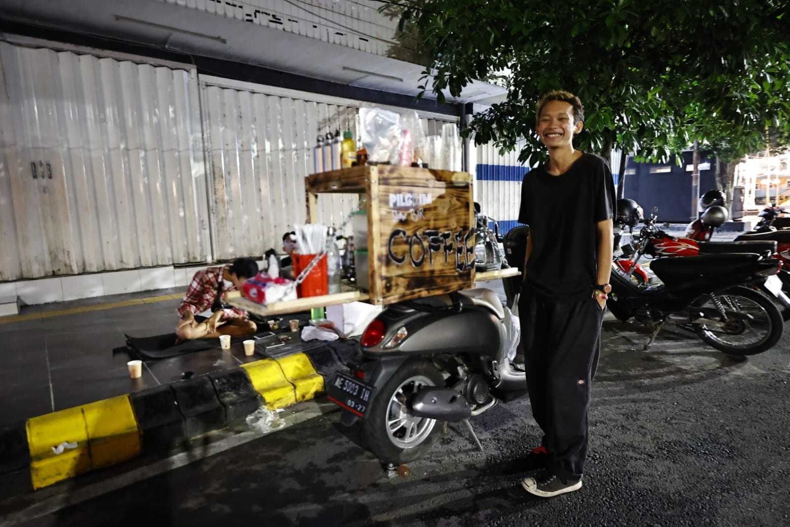 Sehari-hari, Rian menggelar lapak di Jalan Bogowonto. Selain motor, dia juga memanfaatkan sebuah kotak kayu. Di dalamnya terdapat manual presso, grinder bean, ketel, milk jug, dripper French press, kompor lapangan, dan berbagai sirup.