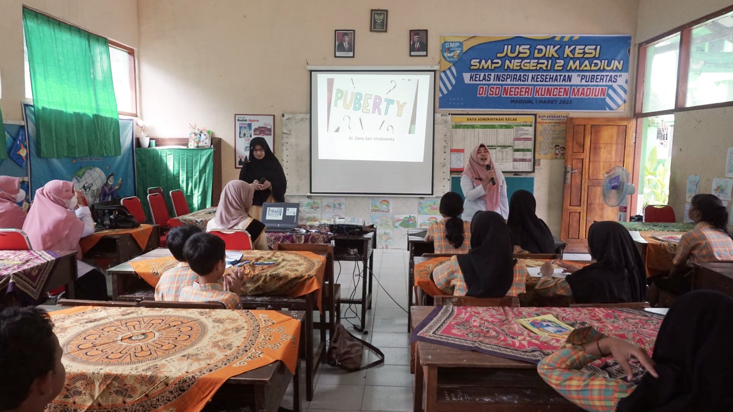 Untuk membagi ilmu seputar kesehatan reproduksi, SMPN 2 Madiun melalui program Jumat Sehat Pendidikan Kesehatan Reproduksi (Jus Dik Kesi) menyambangi sekolah dasar. Salah satunya, SDN Kuncen pada Rabu (1/3).