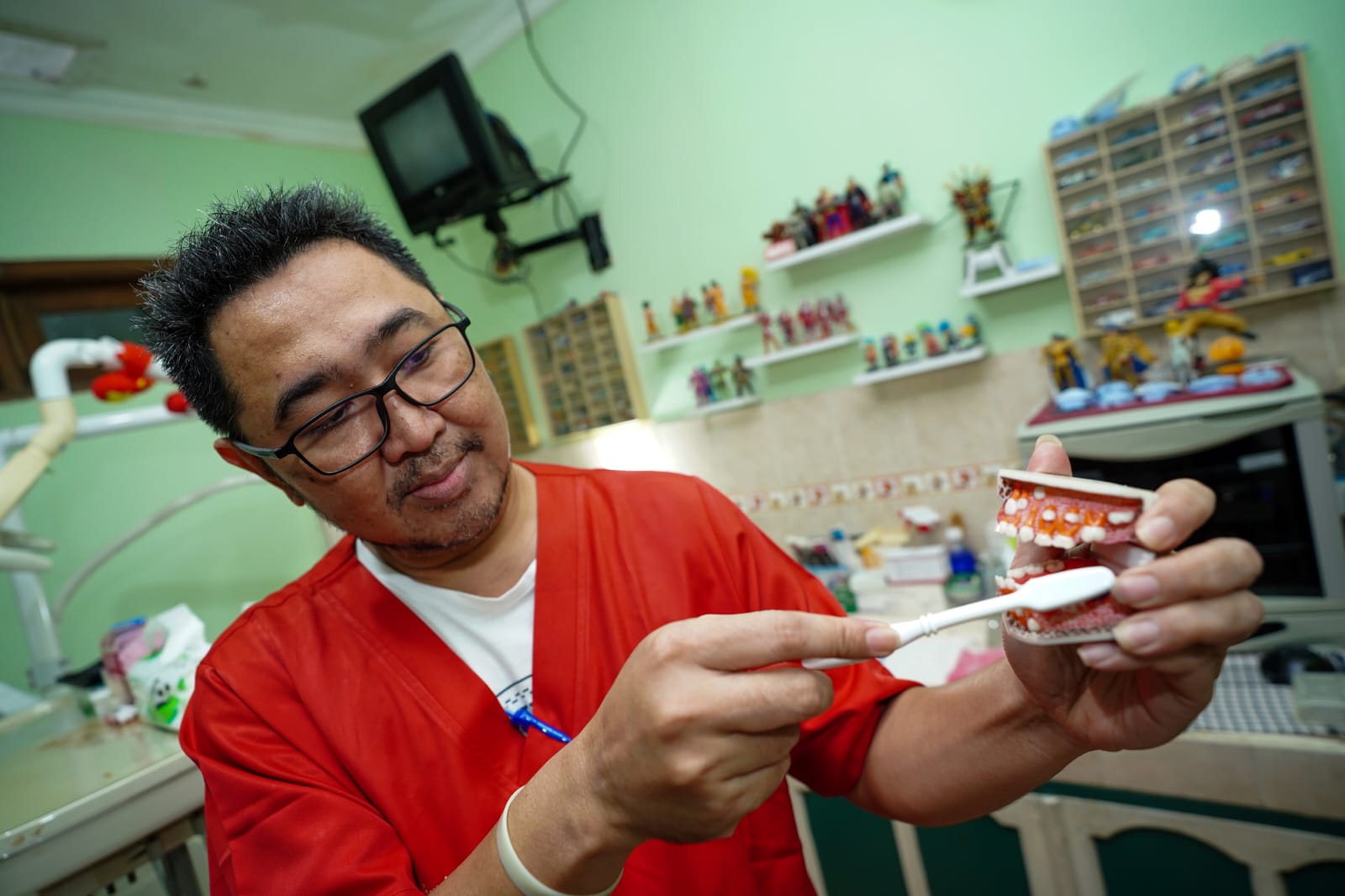 ‘’Cara menggenggam sikat seperti memegang pensil. Kalau megangnya tidak kuat, secara otomatis gerakan menyikatnya juga tidak kenceng,’’ ungkapnya.