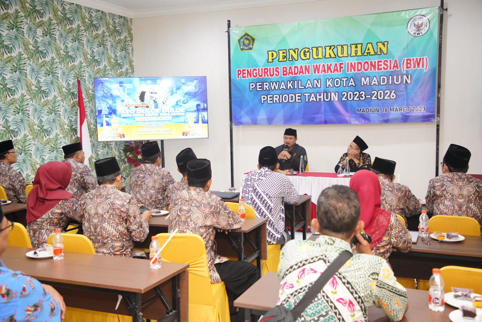 MADIUN – Badan Wakaf Indonesia (BWI) Perwakilan Kota Madiun resmi memiliki pengurus baru. Prosesi pengukuhan berlangsung khidmat di Ayam Goreng Pemuda dan juga dihadiri Wali Kota Madiun, Maidi. Orang nomor satu di Kota Pendekar tersebut berharap kepengurusan BWI perwakilan Kota Madiun untuk periode 2023-2026 tersebut semakin memberikan kemanfaatan bagi masyarakat.