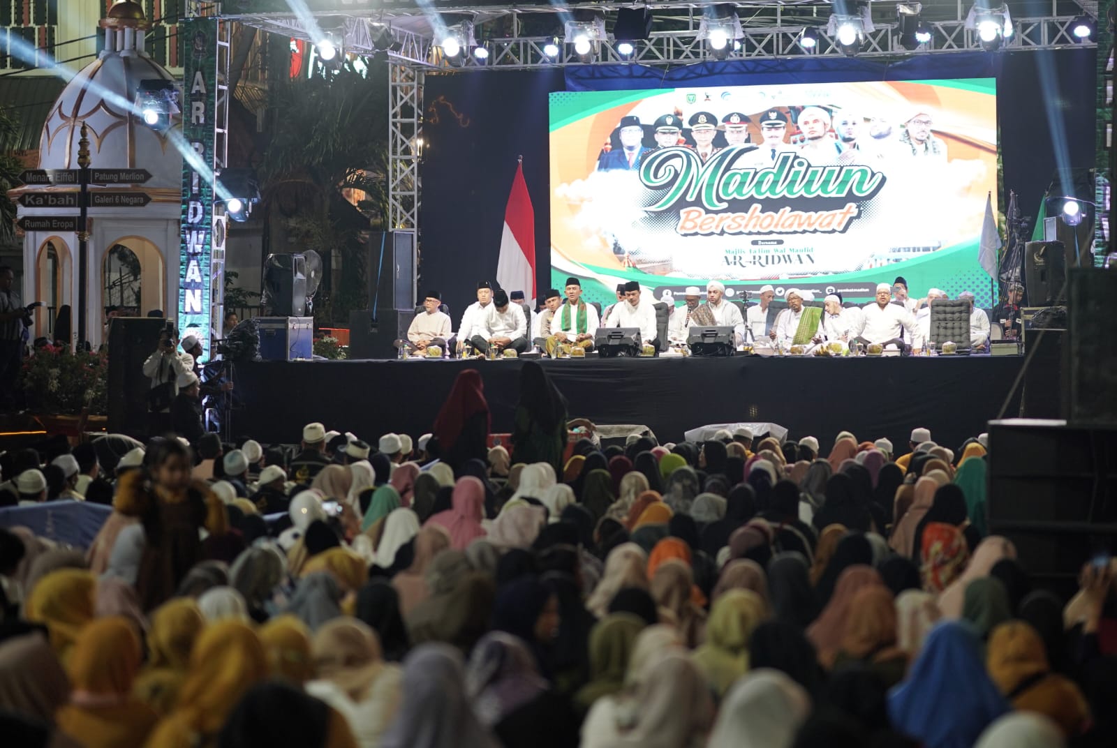 MADIUN – Rangkaian peringatan Hari Jadi ke-105 Kota Madiun berlanjut. Kegiatan peringatan bukan sekedar hiburan semata. Namun, juga bernuansa religi. Salah satunya, Madiun Bersholawat. Kegiatan yang berlangsung di Jalan Pahlawan Kota Madiun ini berlangsung khidmat, Sabtu (8/7). Ribuan jamaah hadir dalam kegiatan yang menghadirkan sejumlah ulama ternama ini.