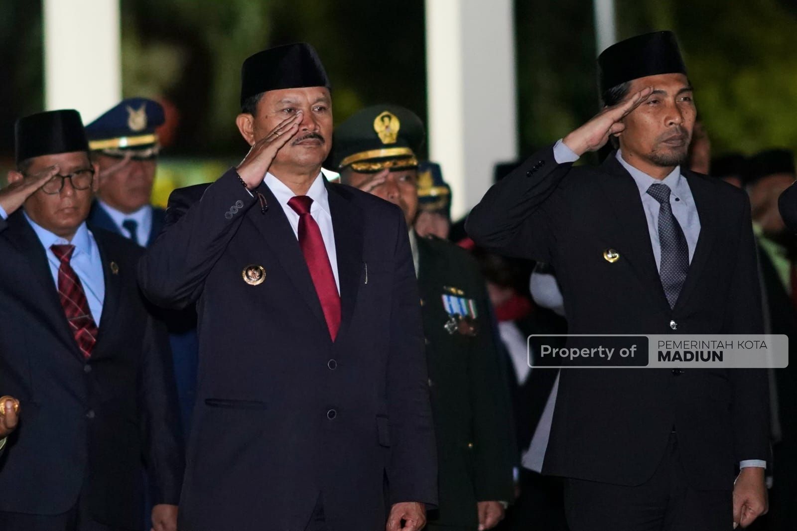 MADIUN – Apel Kehormatan dan Renungan Suci (AKRS) merupakan salah satu agenda penting dalam rangkaian peringatan HUT Kemerdekaan. Kegiatan yang berlangsung di Taman Makam Pahlawan (TMP) itu pun berlangsung khidmat, Kamis (17/8) tepat pukul 00.00. Kegiatan juga diikuti sejumlah pejabat Kota dan Kabupaten Madiun. Tak terkecuali Wali Kota Madiun, Maidi. AKRS kali ini dipimpin Komandan Lanud Iswahjudi, Marsma TNI Wastum.