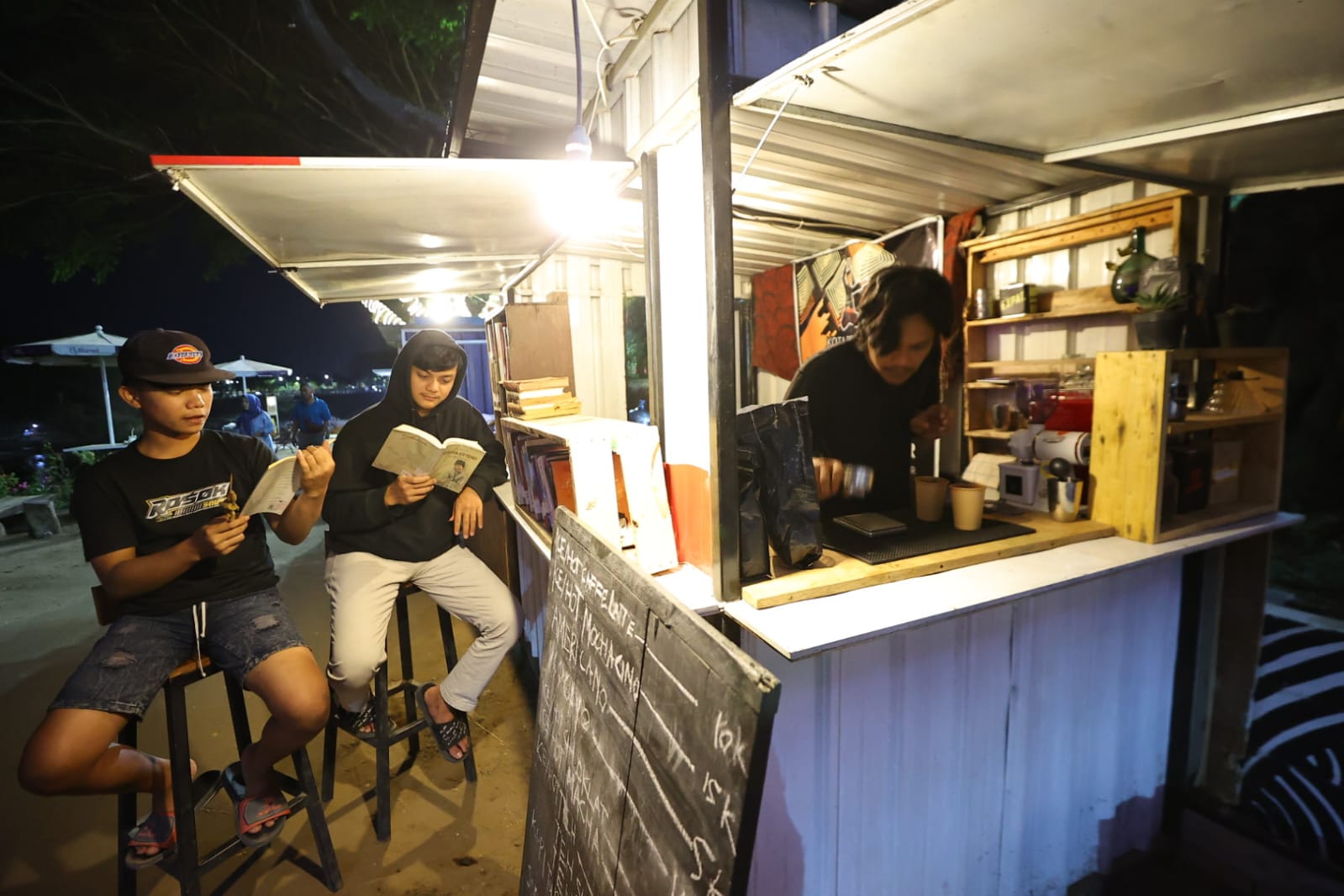 MADIUN – Di kawasan wisata Bantaran Kali Madiun, ada sebuah warung kopi yang unik. Ya, bukan sekedar menawarkan nikmatnya kopi seduh, di warung tersebut juga menyediakan berbagai buku bacaan. Ferrmans Noel Telussa, pemiliknya, sengaja mengkonsep usahanya tersebut menjadi sebuah padepokan kopi dengan sajian warung literasi. Seperti apa?